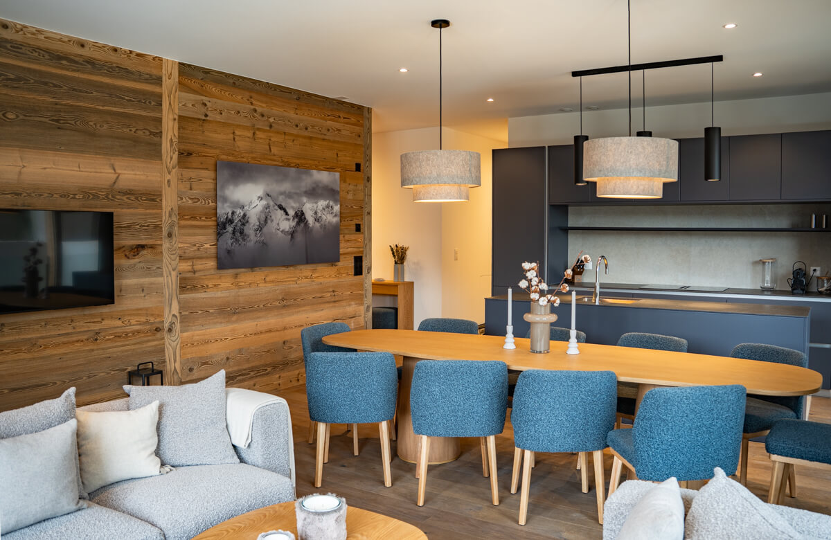 Diese Wohnung verfügt über vier Schlafzimmer mit Doppelbetten (180 × 200 cm und 160 × 200 cm), ein kabinenartiges Schlafzimmer ohne Fenster mit einem ausziehbaren Schlafsofa (160 × 200 cm) sowie über drei Badezimmer. Der Wohnbereich bietet eine Sitzecke mit Fernseher und eine voll ausgestattete offene Küche. Eine möblierte Terrasse ergänzt den Wohnraum. Zur Ausstattung der Wohnung gehören Haushaltsgeräte wie Waschmaschine, Geschirrspüler, Nespresso-Kaffeemaschine, notwendige Küchenutensilien usw.