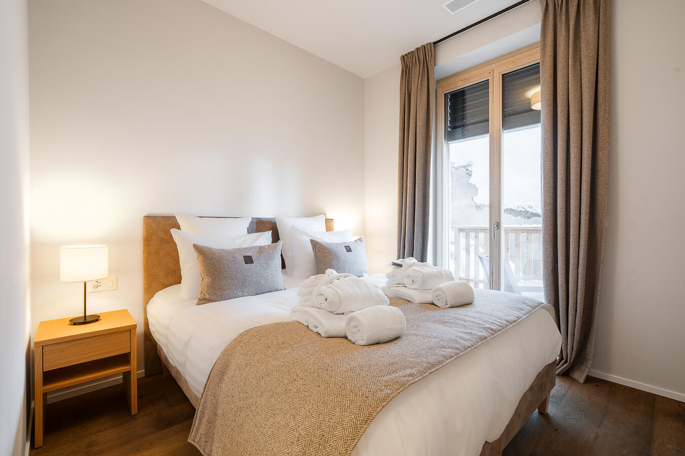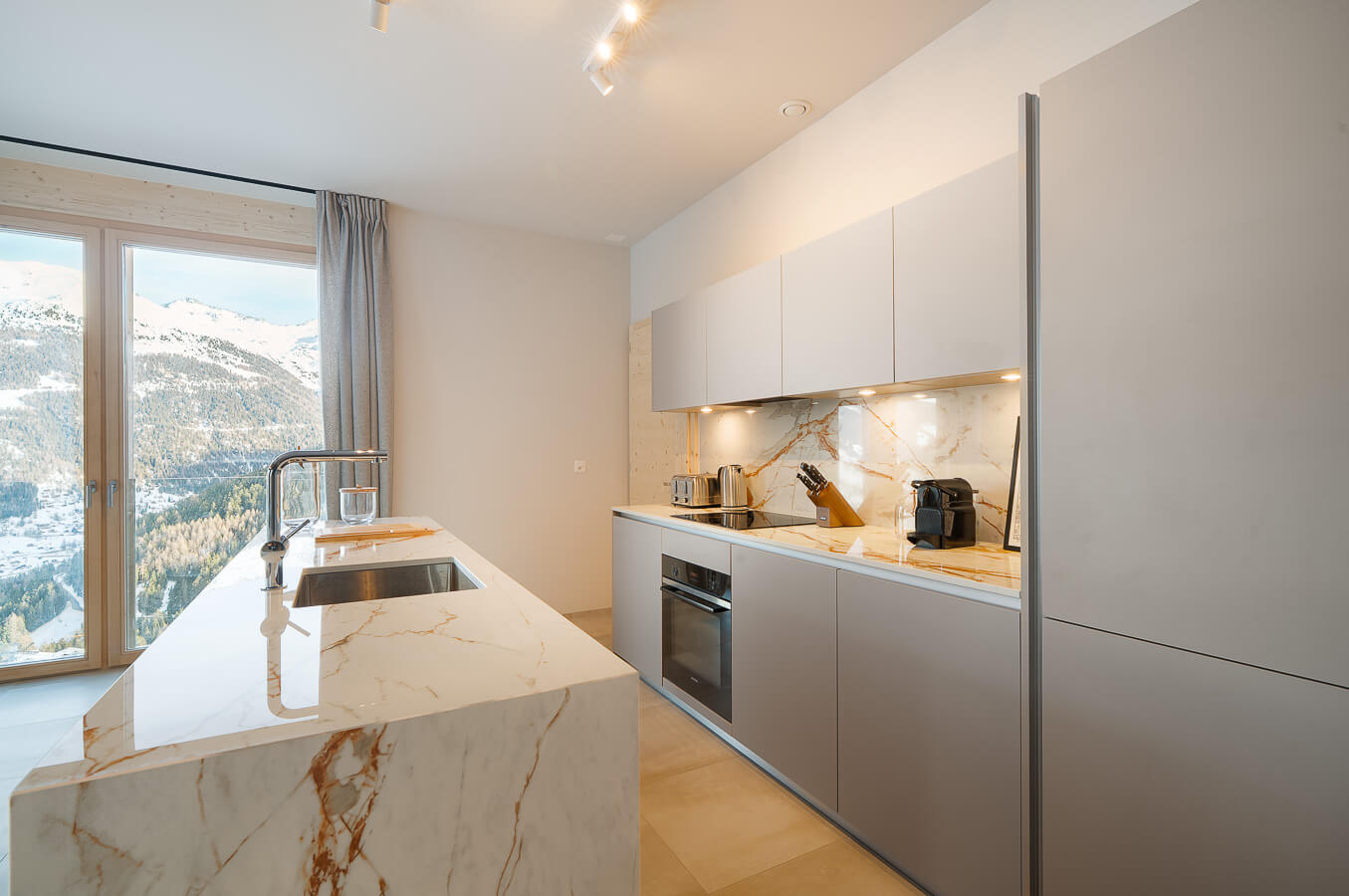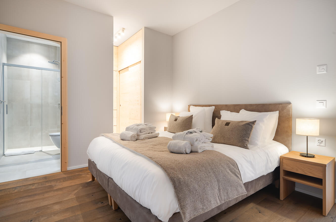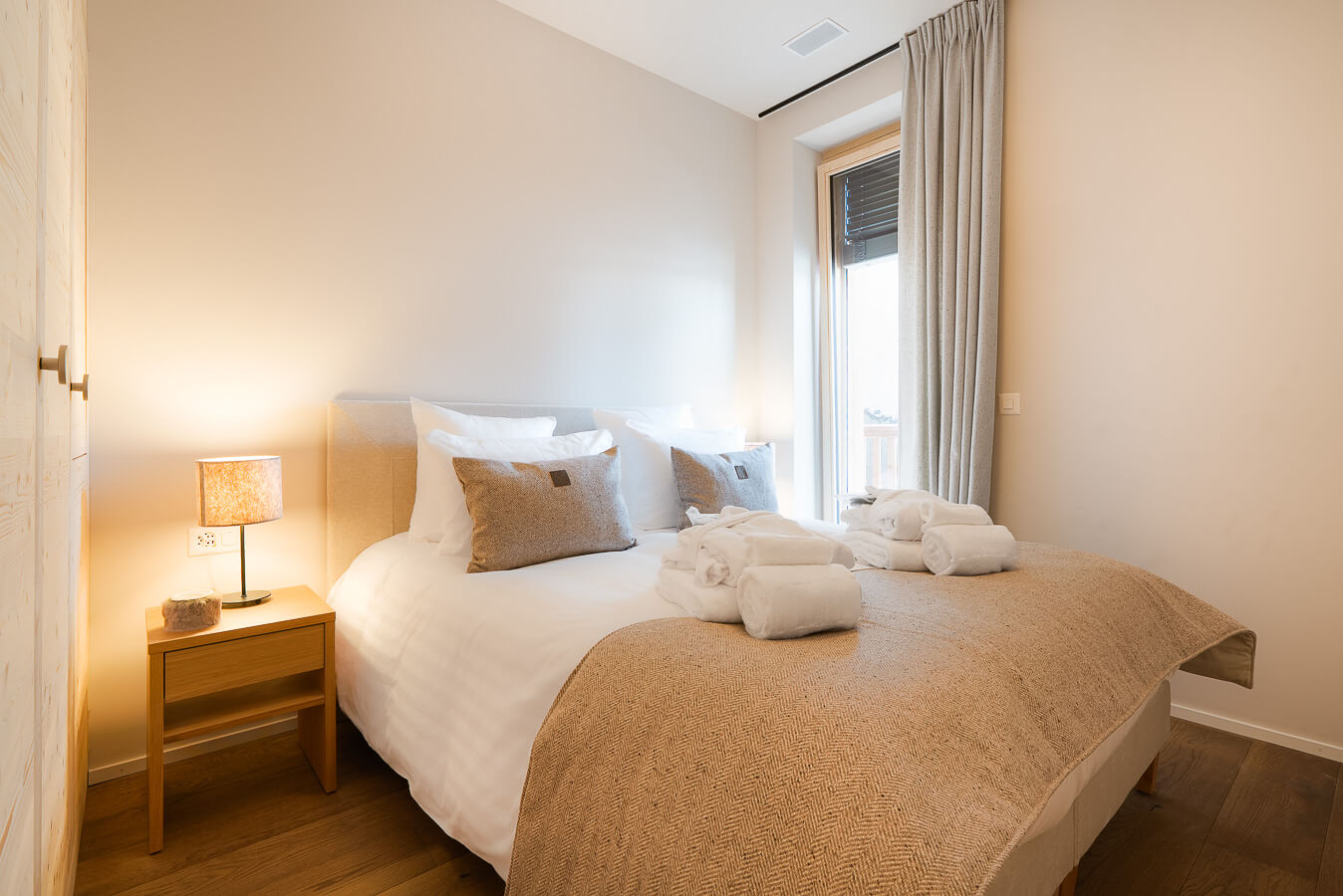 Diese Wohnung verfügt über vier Schlafzimmer mit Doppelbetten (180 × 200 cm, 160 × 200 cm), ein fensterloses Schlafzimmer mit Doppelbett (180 × 200 cm) sowie über drei Badezimmer. Der Wohnbereich bietet eine Sitzecke mit Fernseher und eine voll ausgestattete offene Küche. Möblierte Balkone ergänzen den Wohnraum. Zur Ausstattung der Wohnung gehören Haushaltsgeräte wie Geschirrspüler, Nespresso-Kaffeemaschine, notwendige Küchenutensilien usw.