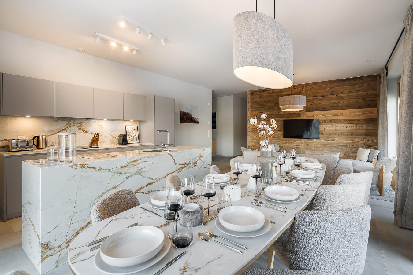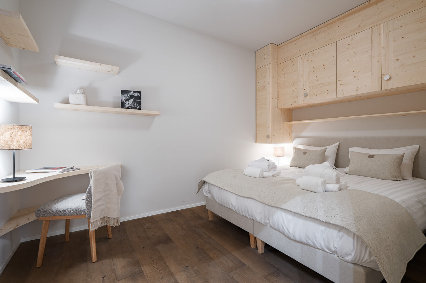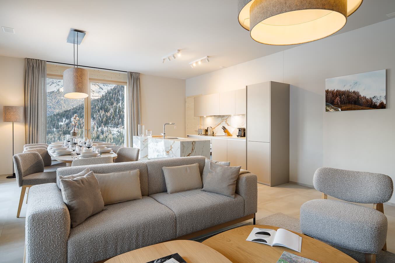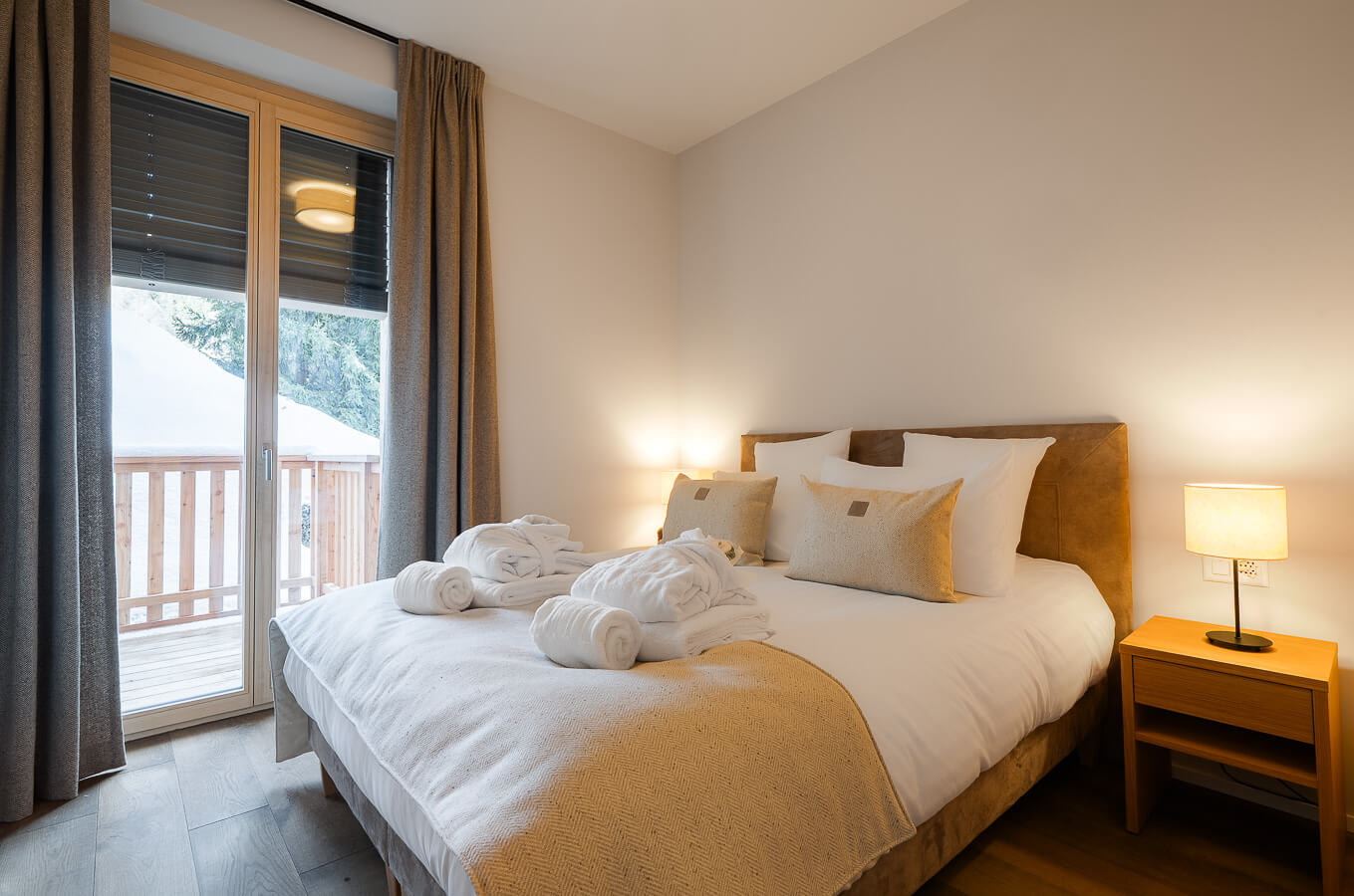 Diese Wohnung verfügt über vier Schlafzimmer mit Doppelbetten (180 × 200 cm, 160 × 200 cm), ein fensterloses Schlafzimmer mit Doppelbett (180 × 200 cm) sowie über drei Badezimmer. Der Wohnbereich bietet eine Sitzecke mit Fernseher und eine voll ausgestattete offene Küche. Möblierte Balkone ergänzen den Wohnraum. Zur Ausstattung der Wohnung gehören Haushaltsgeräte wie Geschirrspüler, Nespresso-Kaffeemaschine, notwendige Küchenutensilien usw.