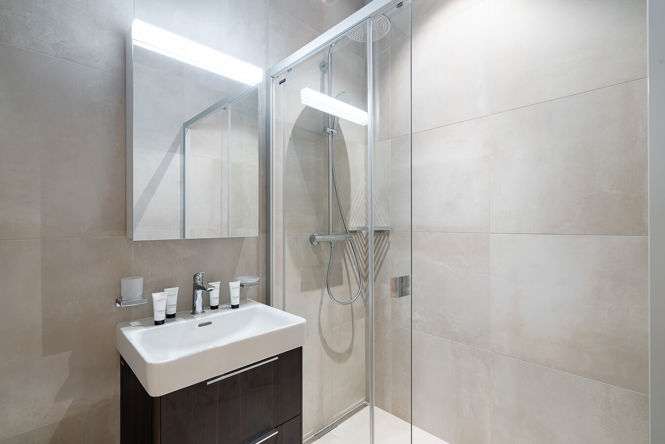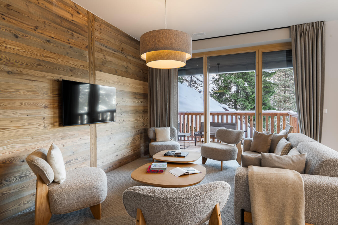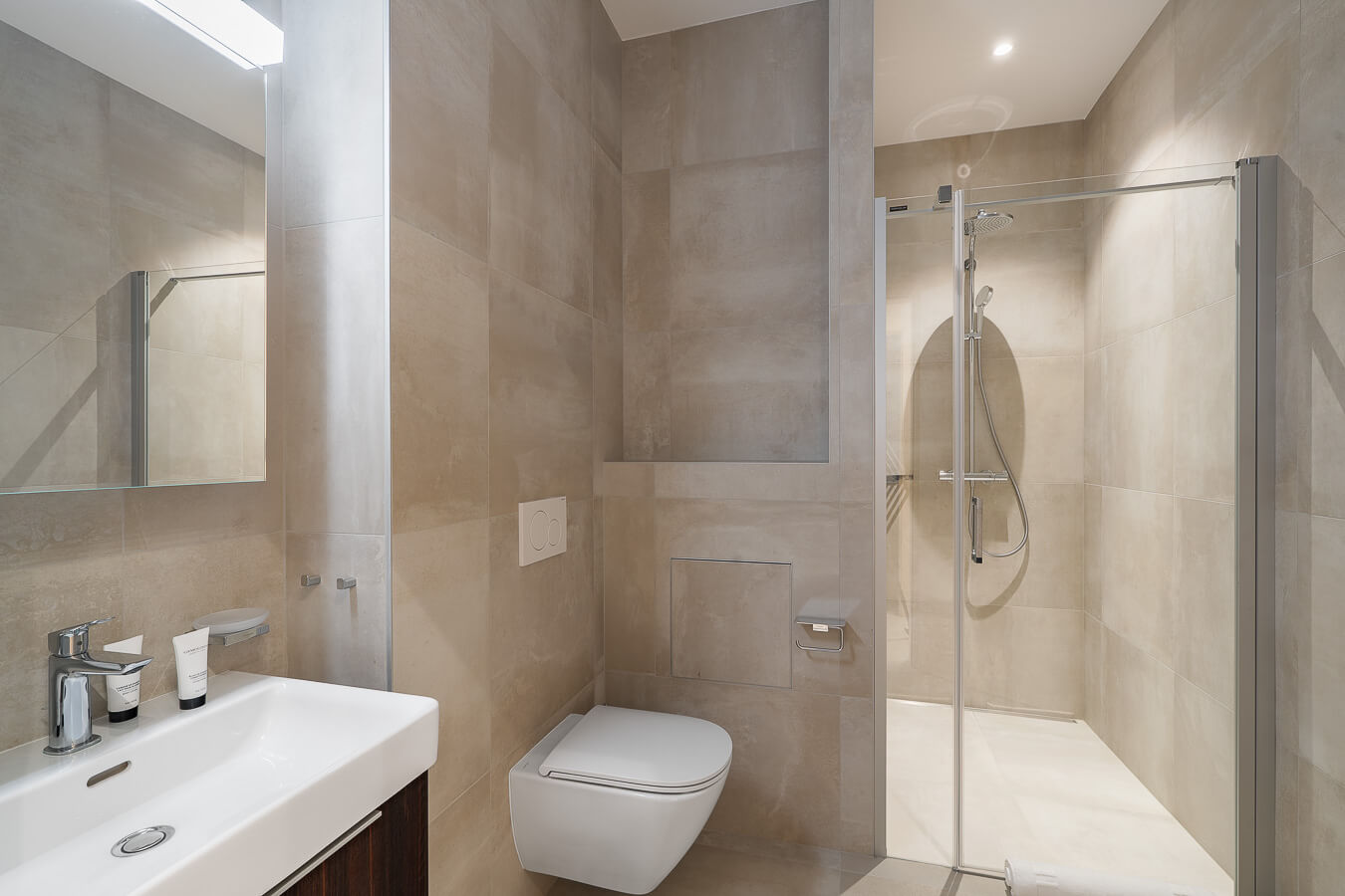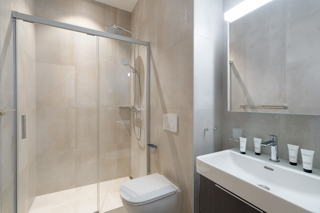 Diese Wohnung verfügt über vier Schlafzimmer mit Doppelbetten (180 × 200 cm, 160 × 200 cm), ein fensterloses Schlafzimmer mit Doppelbett (180 × 200 cm) sowie über drei Badezimmer. Der Wohnbereich bietet eine Sitzecke mit Fernseher und eine voll ausgestattete offene Küche. Möblierte Balkone ergänzen den Wohnraum. Zur Ausstattung der Wohnung gehören Haushaltsgeräte wie Geschirrspüler, Nespresso-Kaffeemaschine, notwendige Küchenutensilien usw.