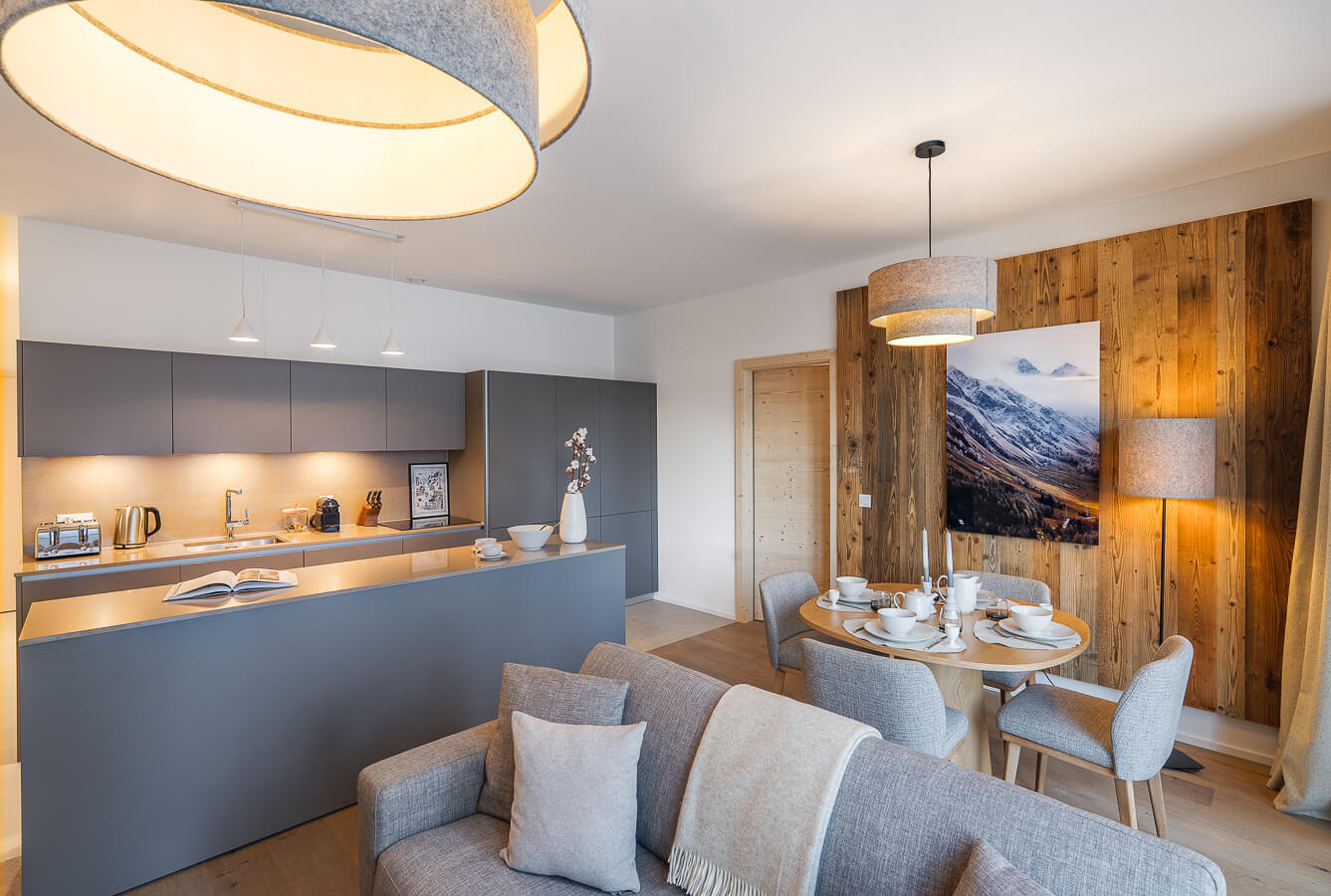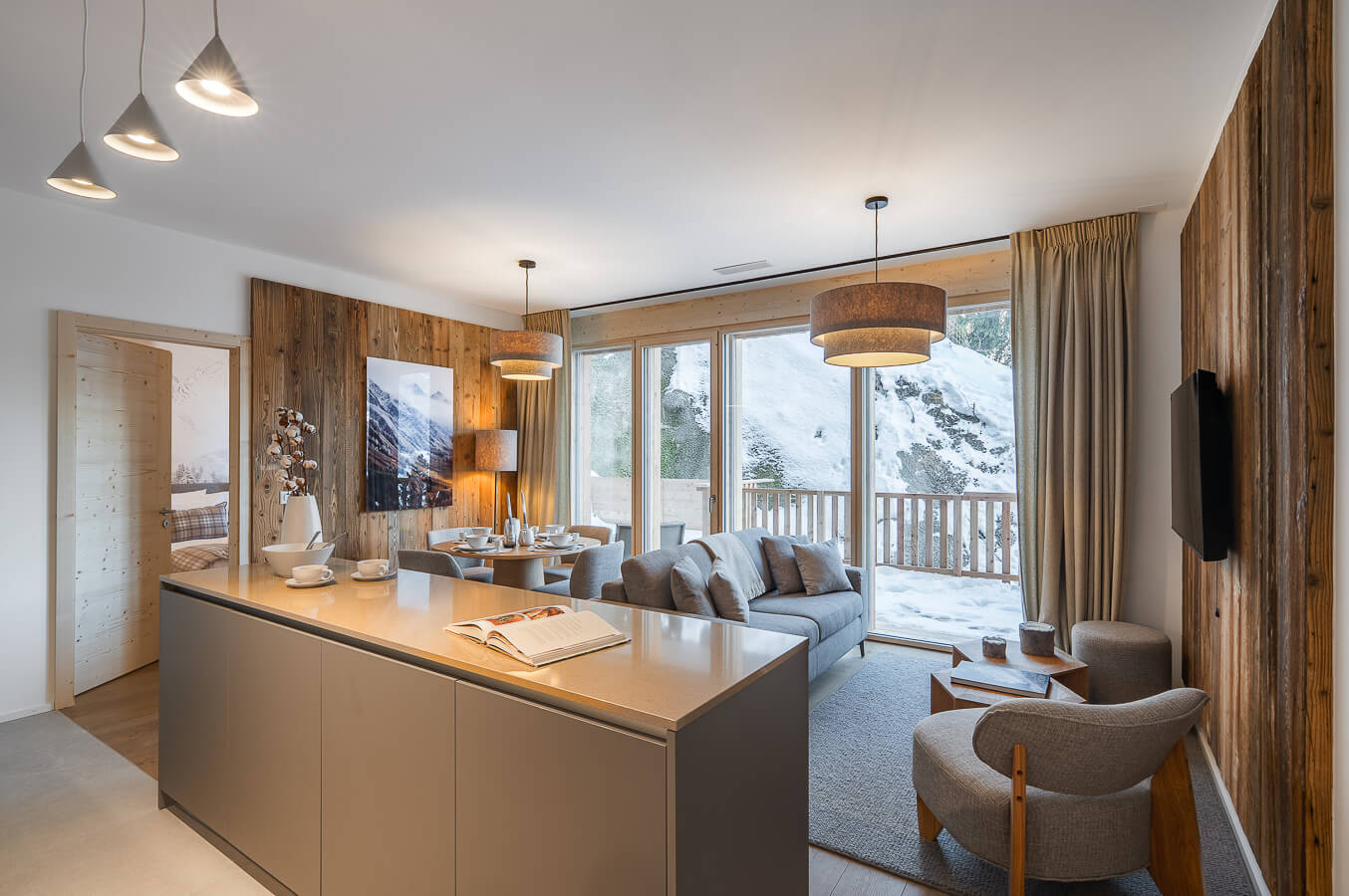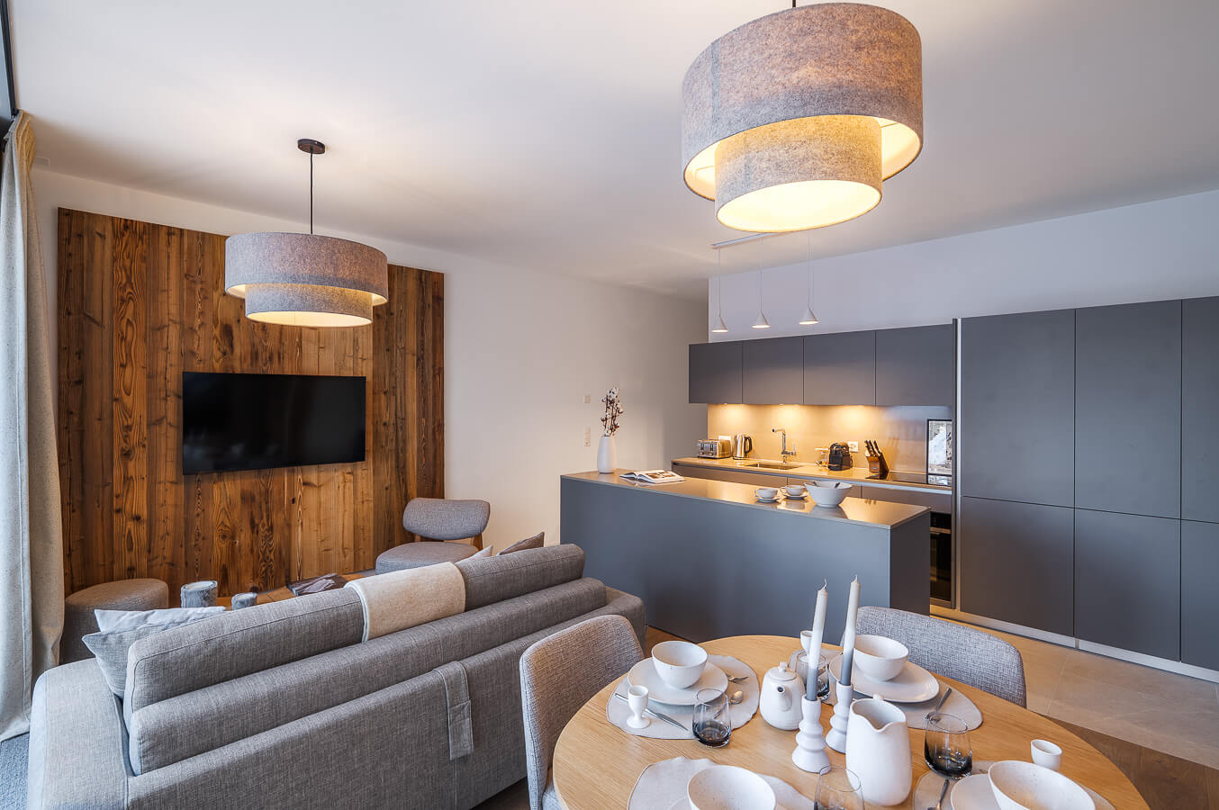 Diese Wohnung verfügt über ein Schlafzimmer mit Doppelbett (180 × 200 cm), ein ausziehbares Schlafsofa im Wohnbereich sowie über ein Badezimmer. Der Wohnbereich bietet eine Sitzecke mit Fernseher und eine voll ausgestattete offene Küche. Eine möblierte Terrasse ergänzt den Wohnraum. Zur Ausstattung der Wohnung gehören Haushaltsgeräte wie Waschmaschine, Geschirrspüler, Nespresso-Kaffeemaschine, notwendige Küchenutensilien usw.