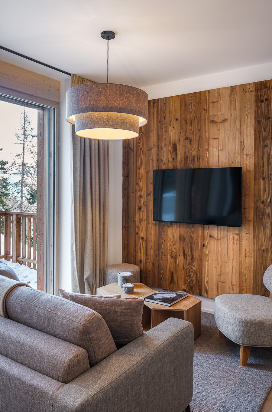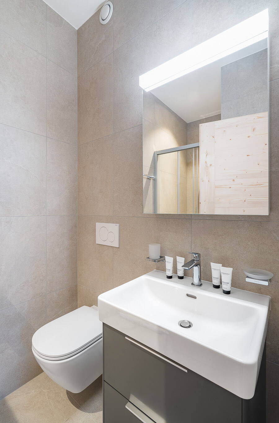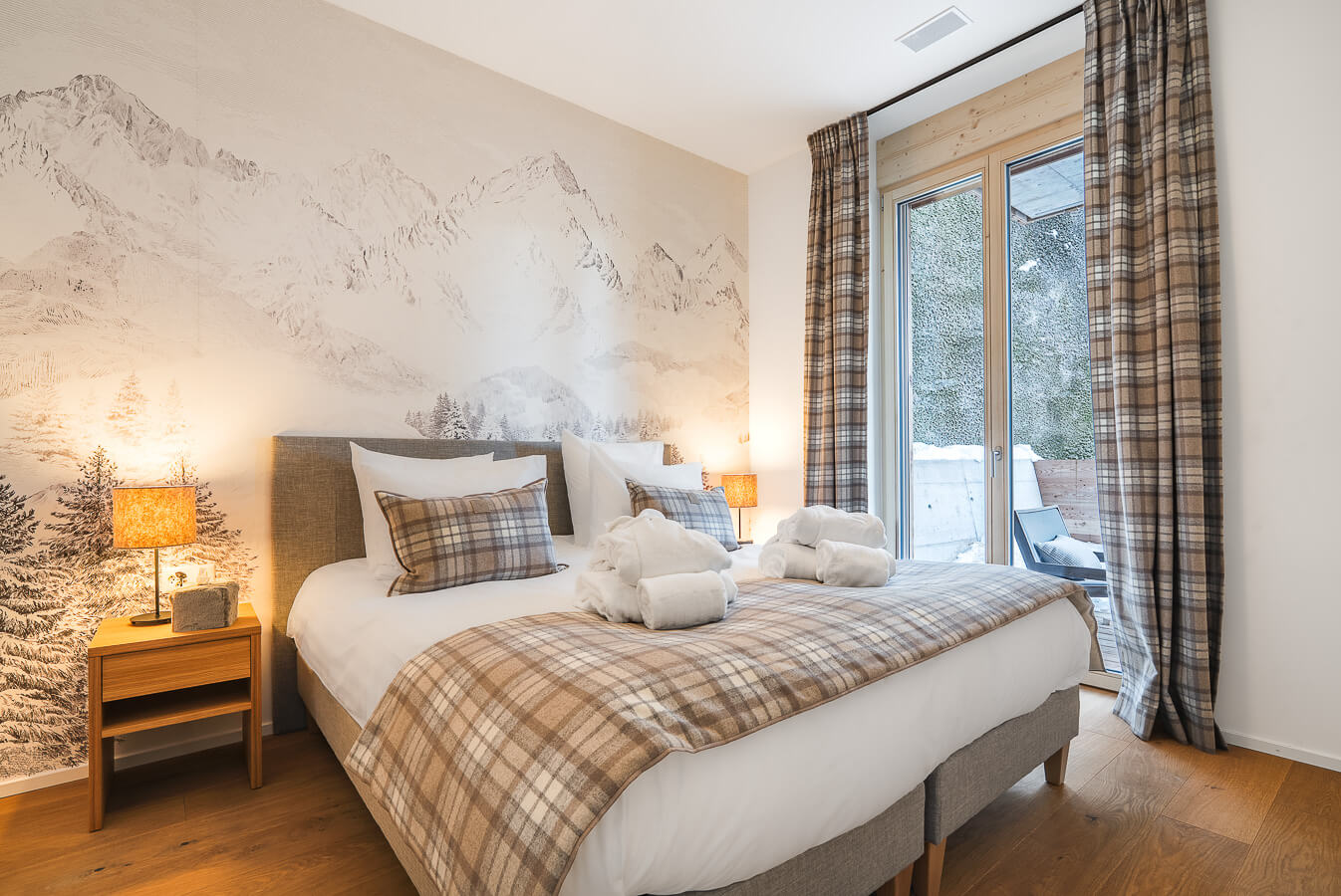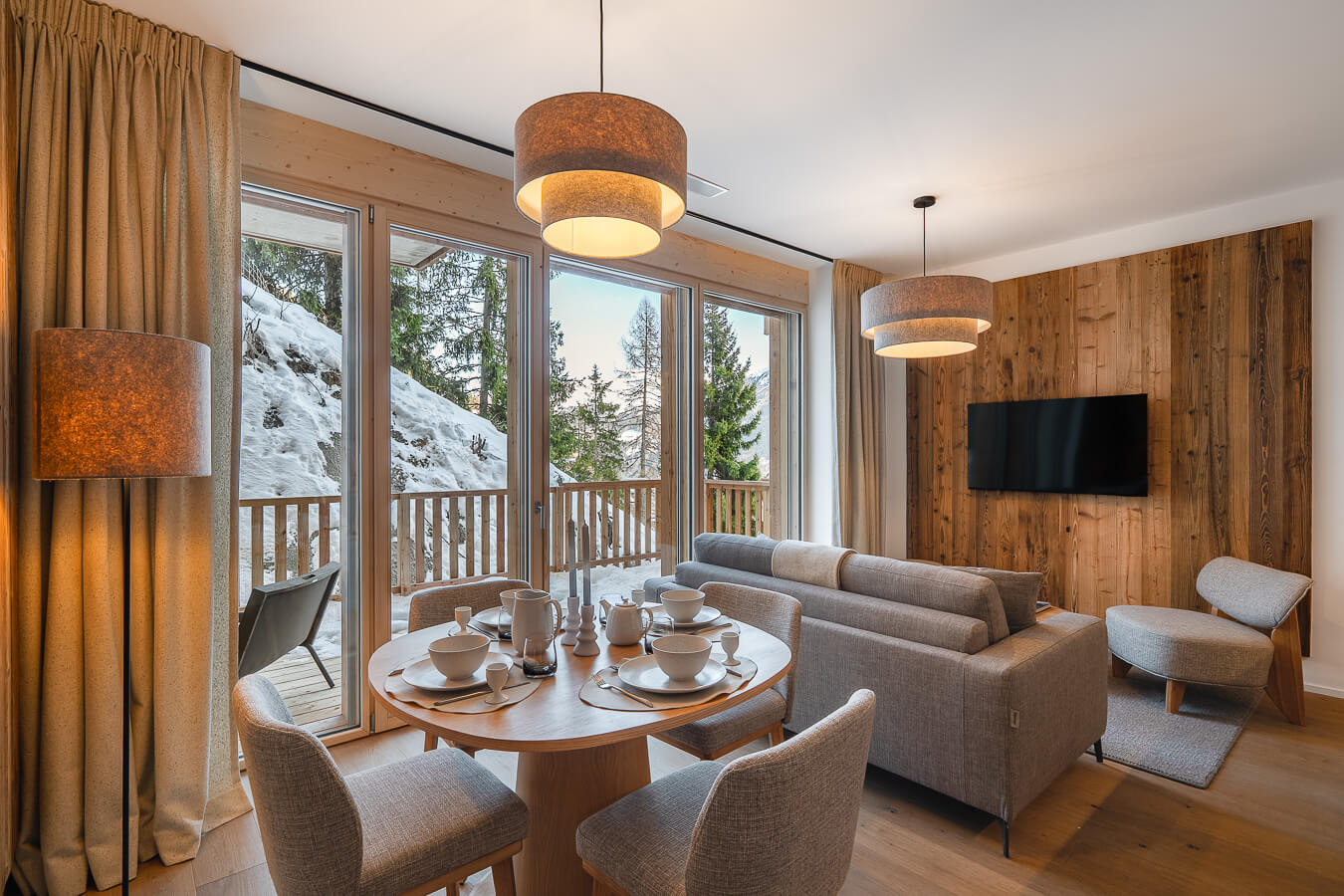 Diese Wohnung verfügt über ein Schlafzimmer mit Doppelbett (180 × 200 cm), ein ausziehbares Schlafsofa im Wohnbereich sowie über ein Badezimmer. Der Wohnbereich bietet eine Sitzecke mit Fernseher und eine voll ausgestattete offene Küche. Eine möblierte Terrasse ergänzt den Wohnraum. Zur Ausstattung der Wohnung gehören Haushaltsgeräte wie Waschmaschine, Geschirrspüler, Nespresso-Kaffeemaschine, notwendige Küchenutensilien usw.