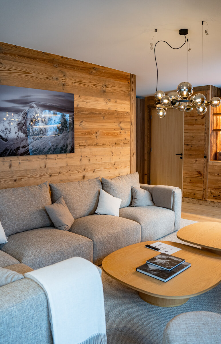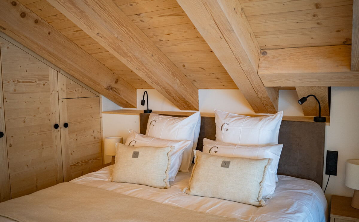 Dieses freistehende Chalet auf drei Ebenen verfügt über drei Schlafzimmer mit Doppelbett (180 × 200 cm), ein Zimmer mit zwei Etagenbetten sowie drei Badezimmer mit Dusche und Badewanne. Der Wohnbereich bietet eine Sitzecke mit Fernseher, eine voll ausgestattete Küche, einen Holzofen und Außenbereiche, darunter eine nach Süden ausgerichtete Terrasse mit freiem Blick auf Sorebois. Das Chalet ist rundum ausgerichtet, wodurch sich Licht und Aussicht im Tagesverlauf ständig verändern. Zur Ausstattung gehören Haushaltsgeräte wie Waschmaschine und Trockner, Geschirrspüler, Nespresso-Kaffeemaschine, notwendige Küchenutensilien usw.