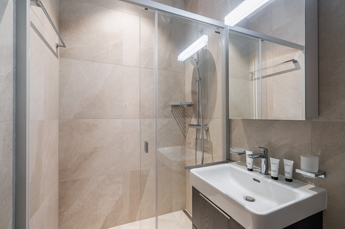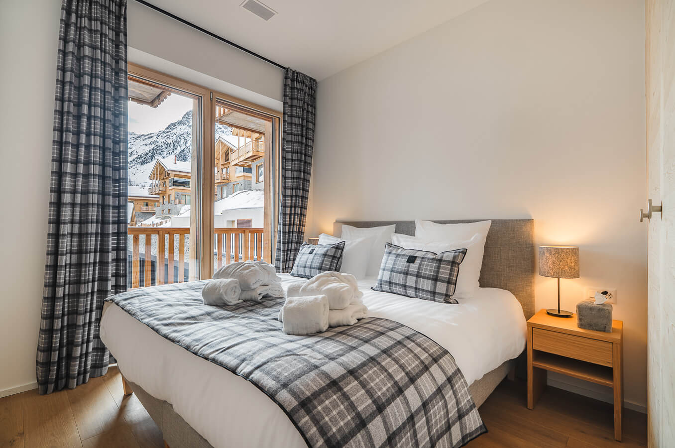 Diese Wohnung verfügt über drei Schlafzimmer mit einem Doppelbett (180 × 200 cm), ein Kabinenschlafzimmer mit Etagenbett sowie über drei Badezimmer. Der Wohnbereich bietet eine Sitzecke mit Fernseher und eine voll ausgestattete offene Küche. Zwei Balkone ergänzen den Wohnraum. Zur Ausstattung der Wohnung gehören Haushaltsgeräte wie eine Waschmaschine, ein Geschirrspüler, eine Nespresso-Kaffeemaschine, die notwendigen Küchenutensilien usw.