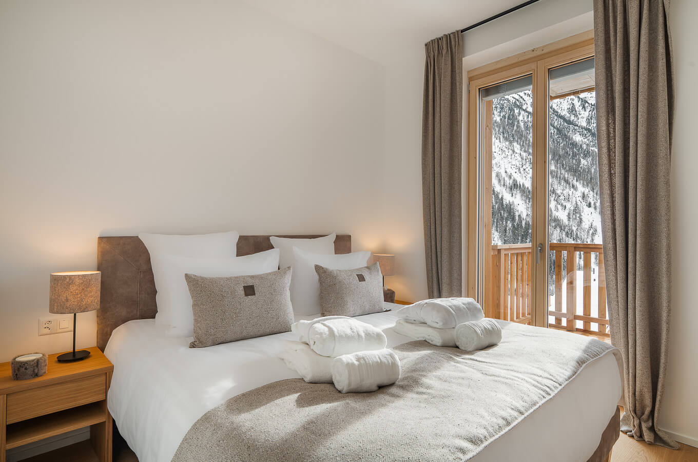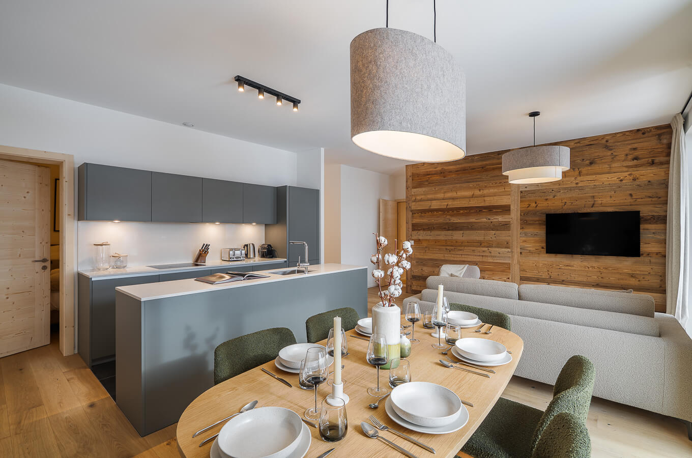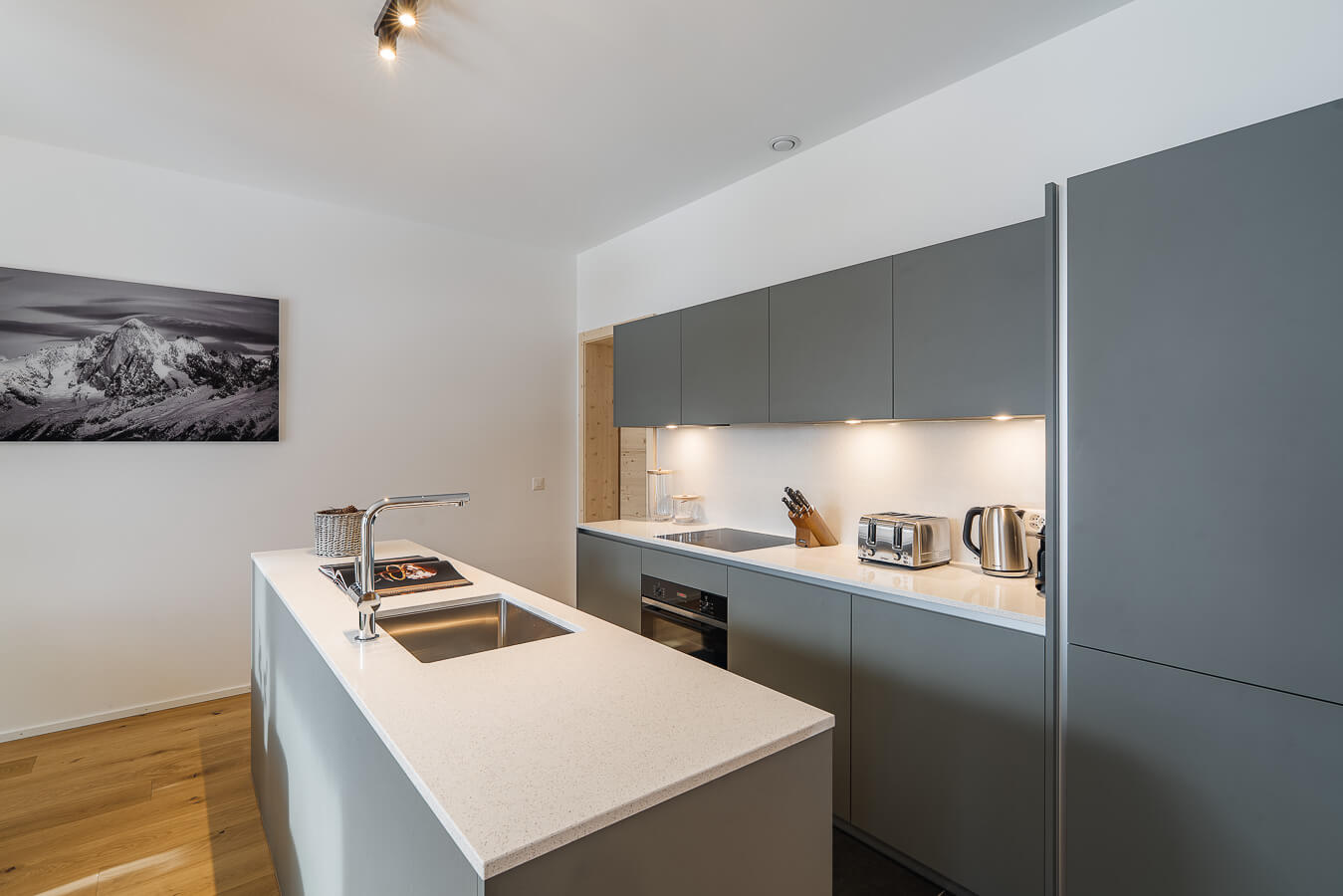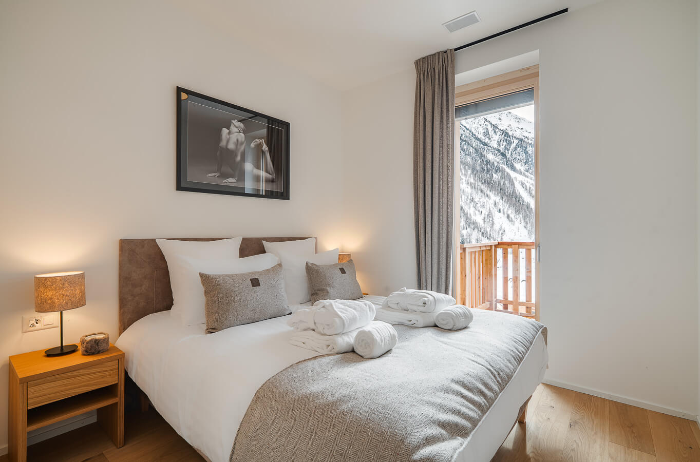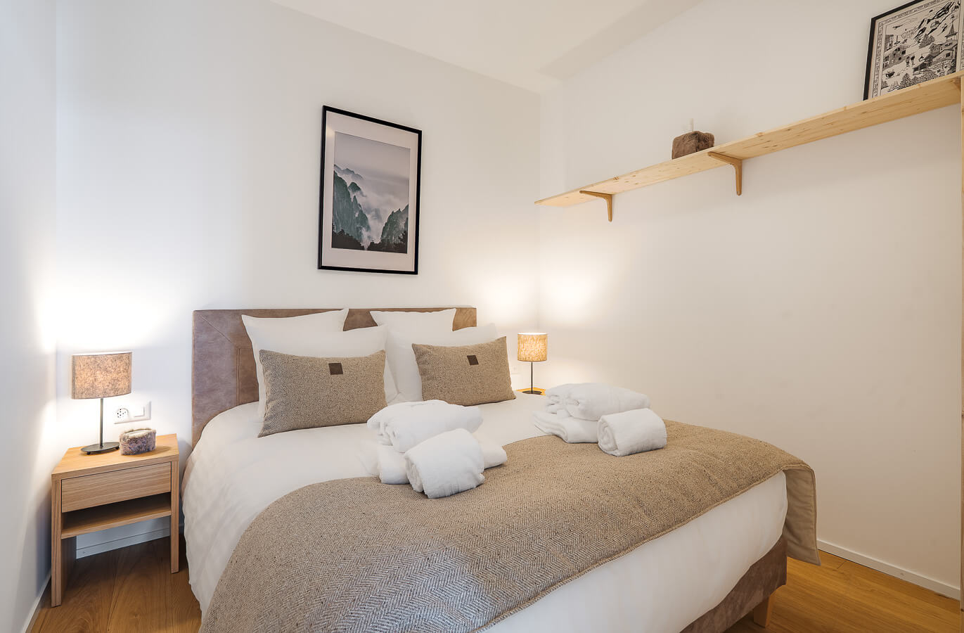 Diese Wohnung verfügt über zwei Schlafzimmer mit Doppelbetten (180 × 200 cm, 160 × 200 cm), ein fensterloses Schlafzimmer mit Doppelbett (160 × 200 cm) sowie über zwei Badezimmer, eines davon mit Badewanne. Der Wohnbereich bietet eine Sitzecke mit Fernseher und eine voll ausgestattete offene Küche. Möblierte Balkone ergänzen den Wohnraum. Zur Ausstattung der Wohnung gehören Haushaltsgeräte wie Waschmaschine, Geschirrspüler, Nespresso-Kaffeemaschine, notwendige Küchenutensilien usw.