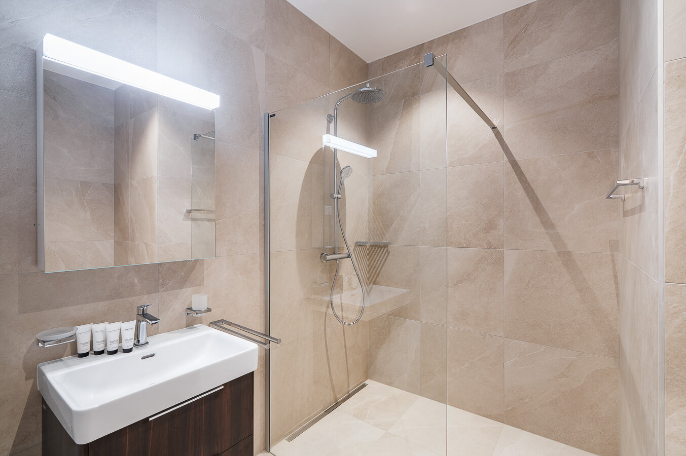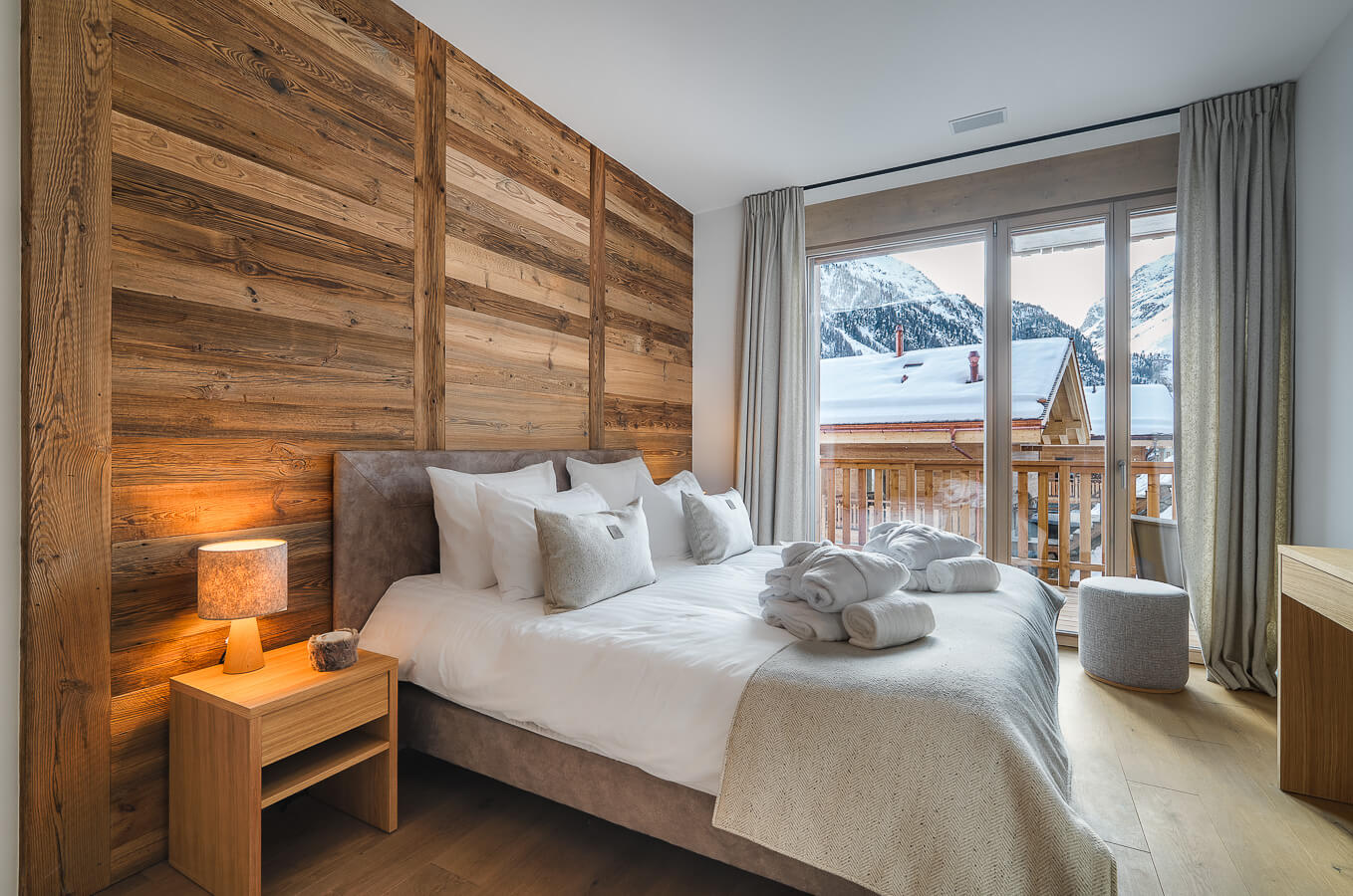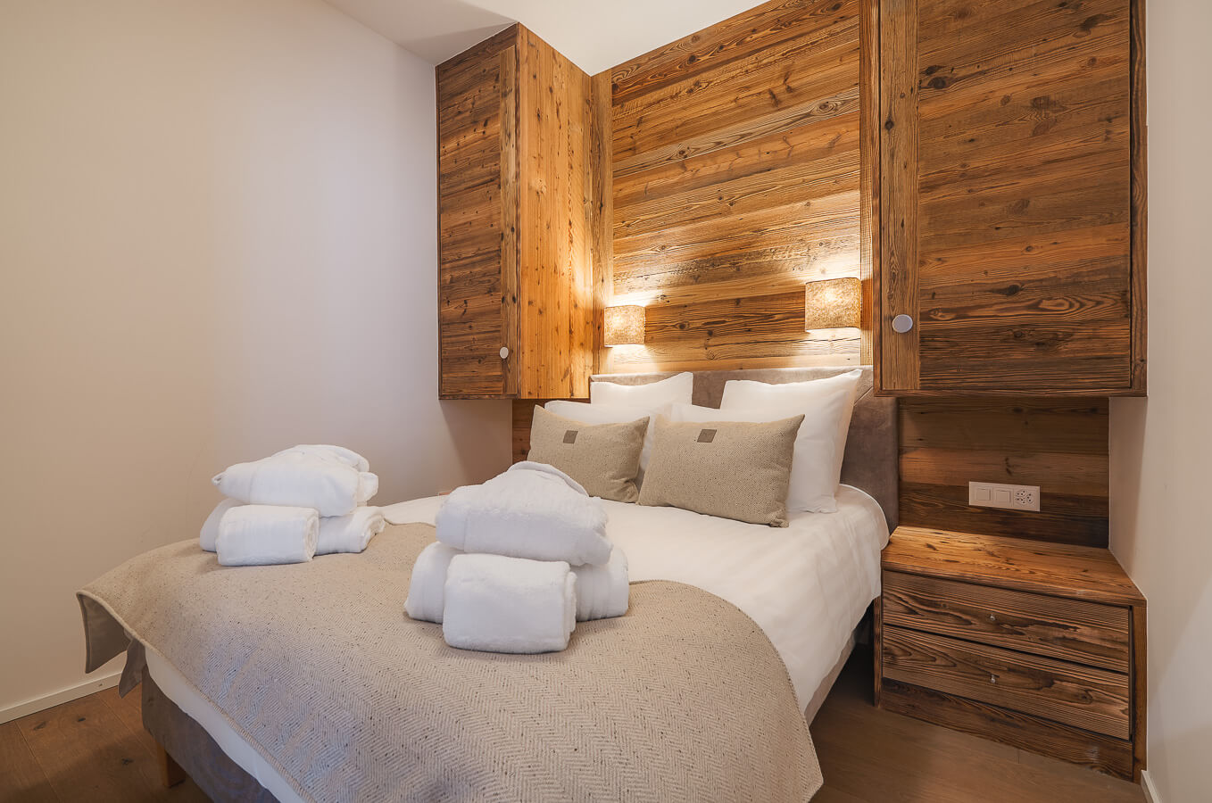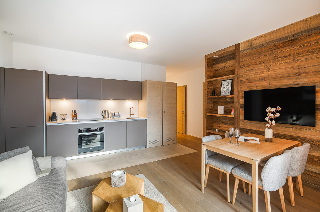 Diese Wohnung verfügt über ein Schlafzimmer mit Doppelbett (180 × 200 cm), ein fensterloses Schlafzimmer mit Doppelbett (140 × 200 cm) sowie über ein Badezimmer. Der Wohnbereich bietet eine Sitzecke mit Fernseher und eine voll ausgestattete offene Küche. Eine möblierte Terrasse ergänzt den Wohnraum. Zur Ausstattung der Wohnung gehören Haushaltsgeräte wie Geschirrspüler, Nespresso-Kaffeemaschine, notwendige Küchenutensilien usw.