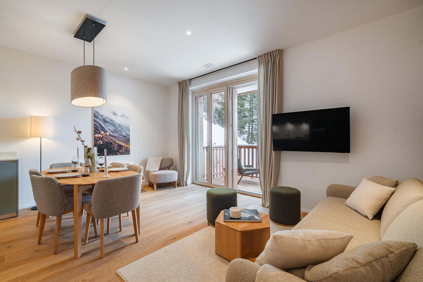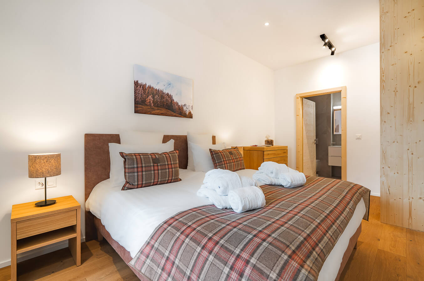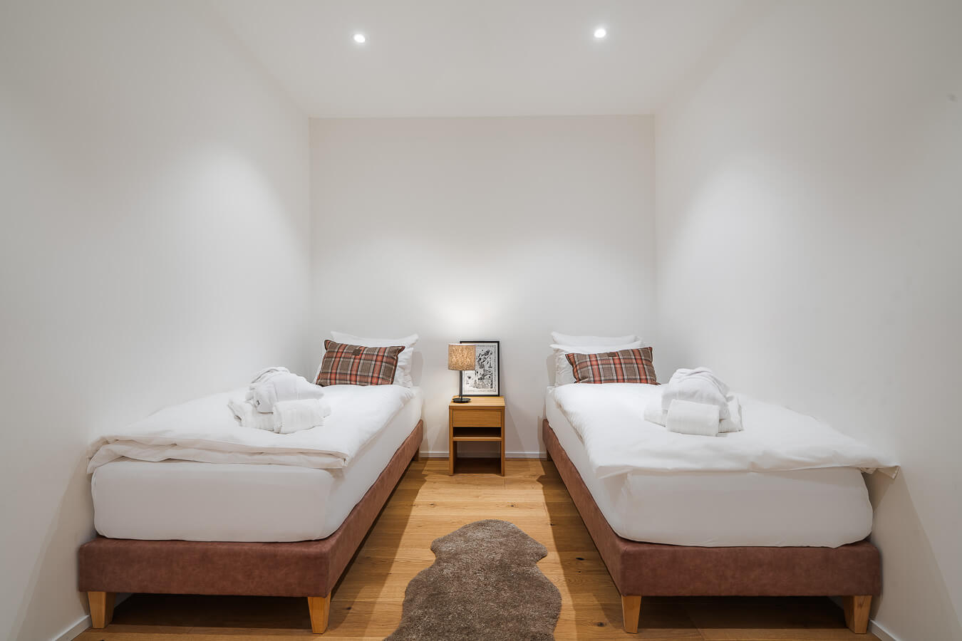 Diese Wohnung verfügt über ein Schlafzimmer mit Doppelbett (180 × 200 cm), ein fensterloses Schlafzimmer mit zwei Einzelbetten (90 × 200 cm) sowie über zwei Badezimmer. Der Wohnbereich bietet eine Sitzecke mit Fernseher und eine voll ausgestattete offene Küche. Möblierte Balkone ergänzen den Wohnraum. Zur Ausstattung der Wohnung gehören Haushaltsgeräte wie Waschmaschine und Trockner, Geschirrspüler, Nespresso-Kaffeemaschine, notwendige Küchenutensilien usw.