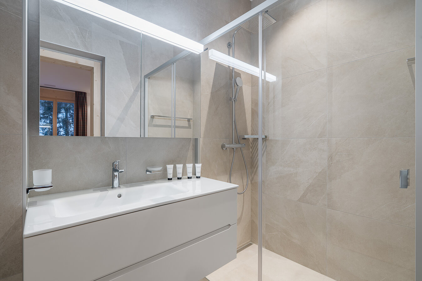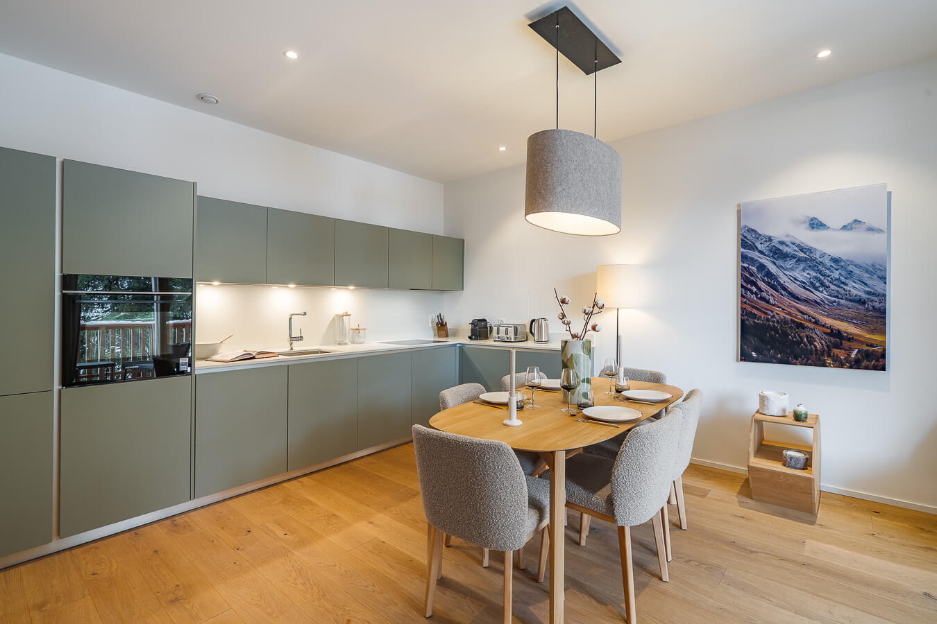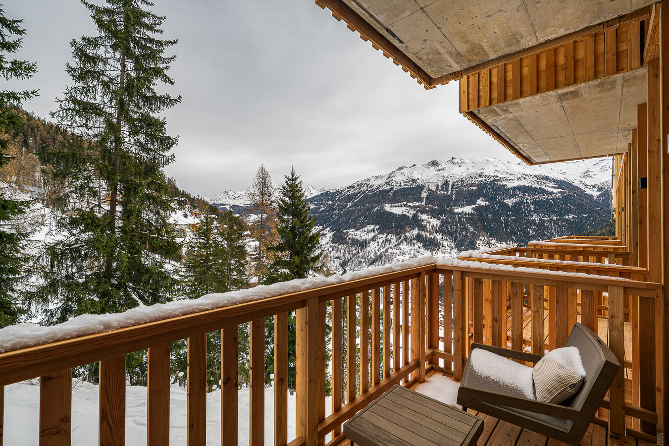 Diese Wohnung verfügt über ein Schlafzimmer mit Doppelbett (180 × 200 cm), ein fensterloses Schlafzimmer mit zwei Einzelbetten (90 × 200 cm) sowie über zwei Badezimmer. Der Wohnbereich bietet eine Sitzecke mit Fernseher und eine voll ausgestattete offene Küche. Möblierte Balkone ergänzen den Wohnraum. Zur Ausstattung der Wohnung gehören Haushaltsgeräte wie Waschmaschine und Trockner, Geschirrspüler, Nespresso-Kaffeemaschine, notwendige Küchenutensilien usw.