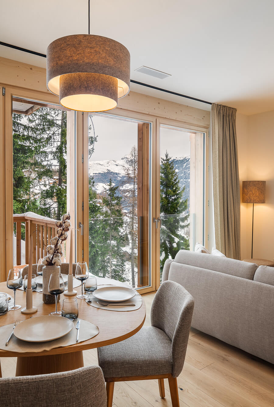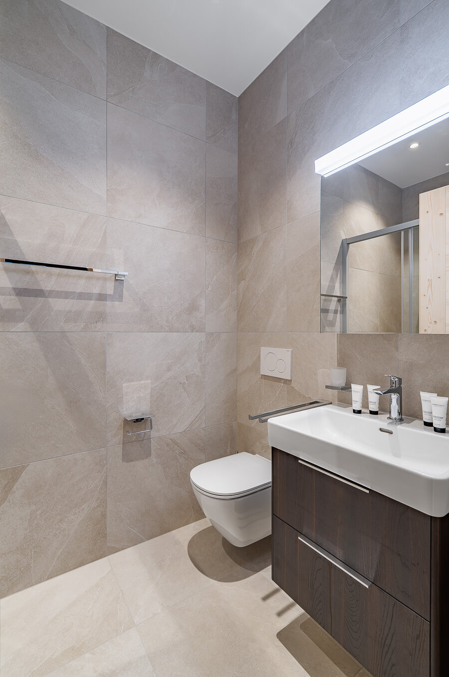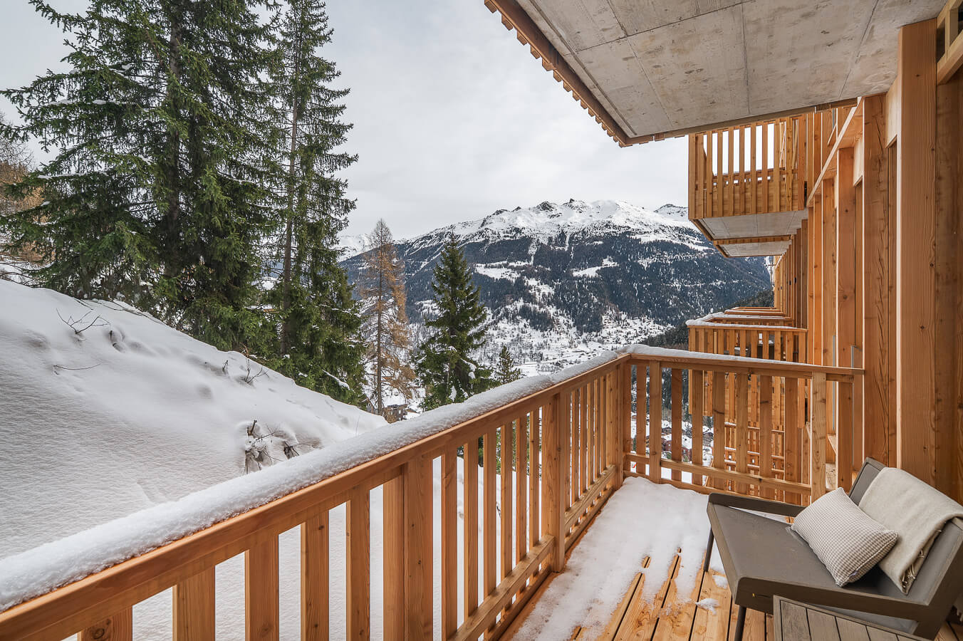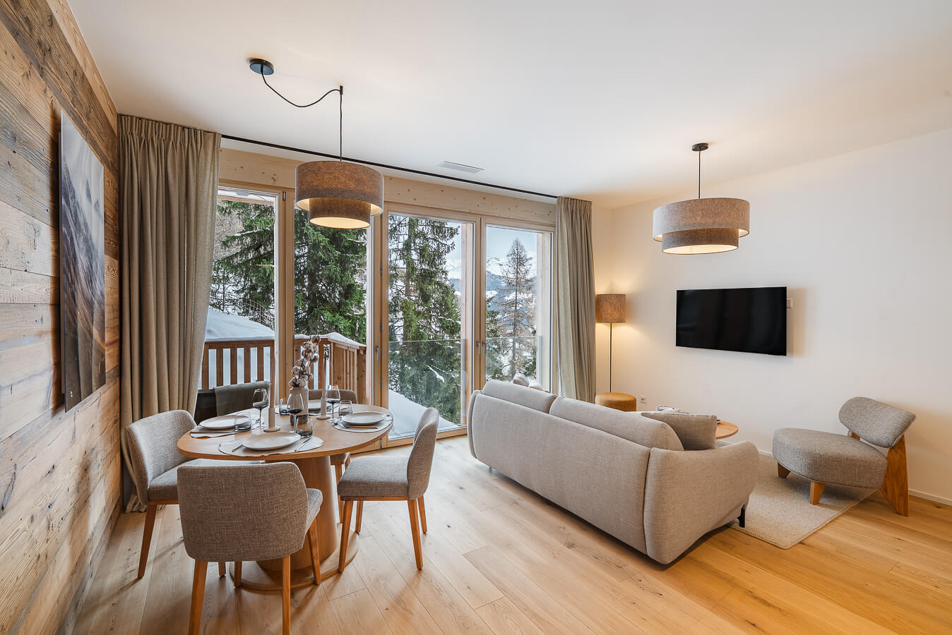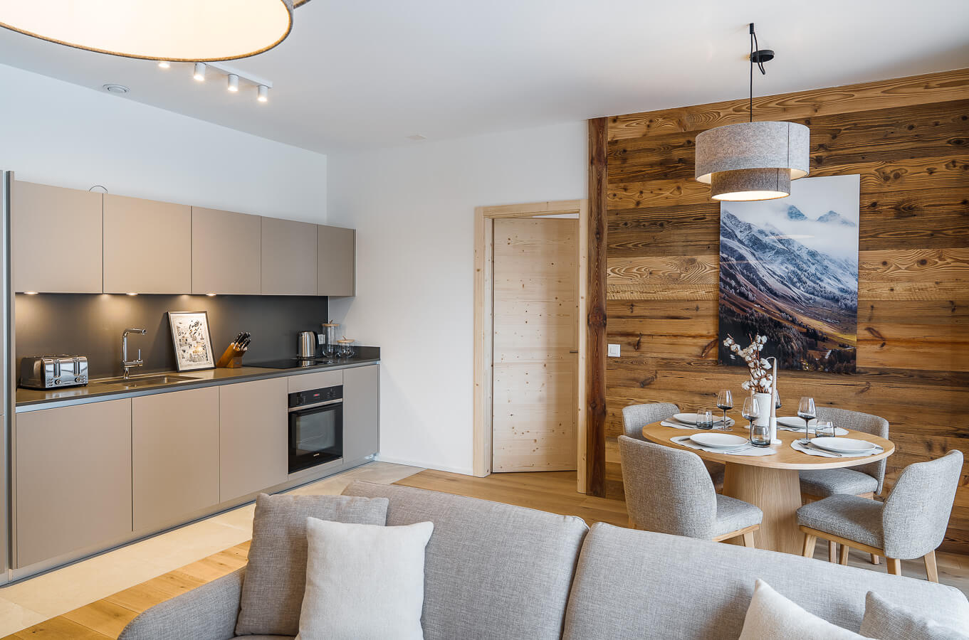 Diese Wohnung verfügt über ein Schlafzimmer mit Doppelbett (180 × 200 cm) sowie über ein Badezimmer. Der Wohnbereich bietet eine Sitzecke mit Fernseher und eine voll ausgestattete offene Küche. Ein Balkon ergänzt den Wohnraum. Zur Ausstattung der Wohnung gehören Haushaltsgeräte wie Geschirrspüler, Nespresso-Kaffeemaschine, notwendige Küchenutensilien usw.