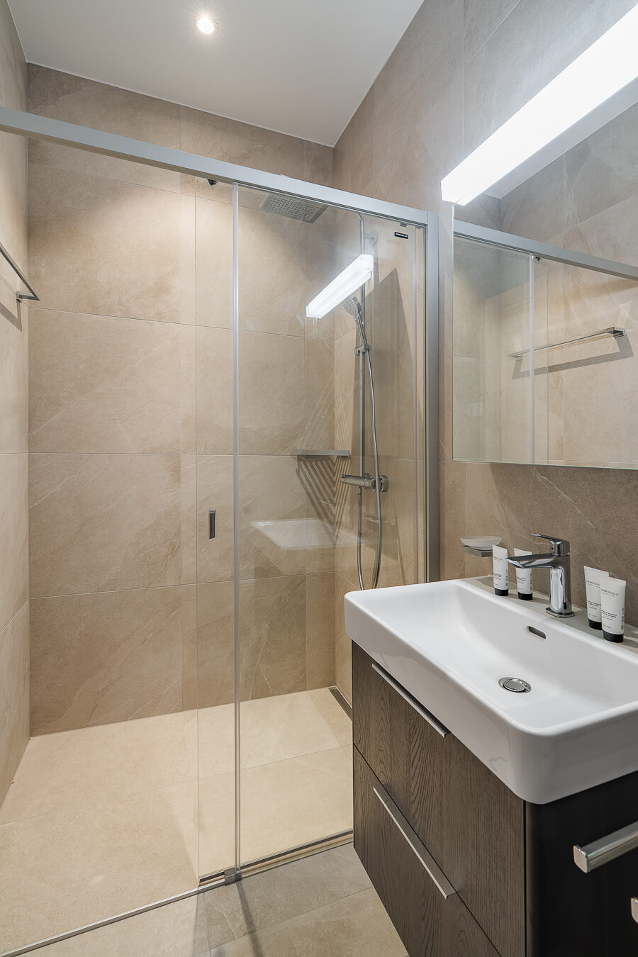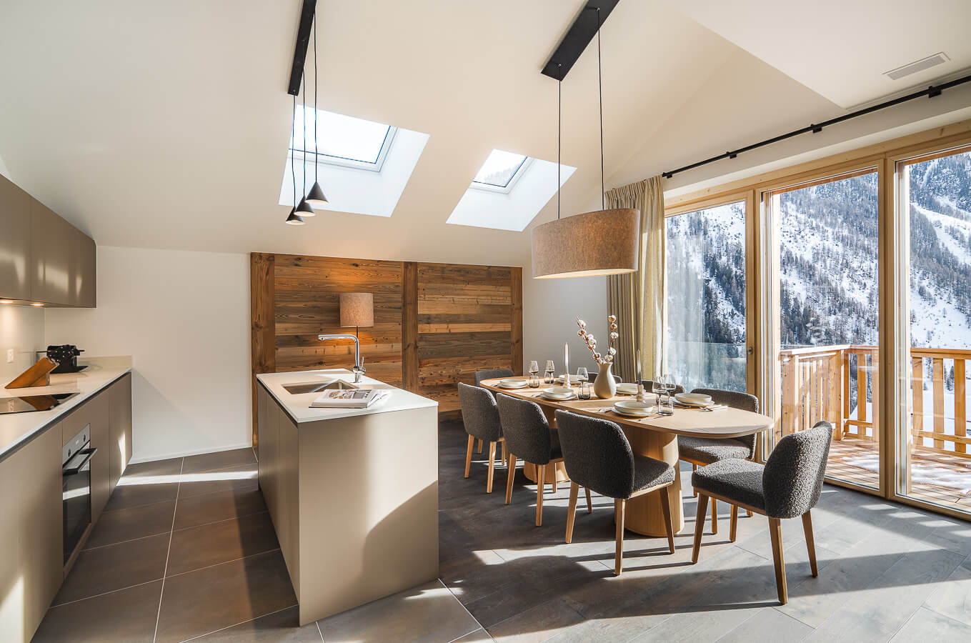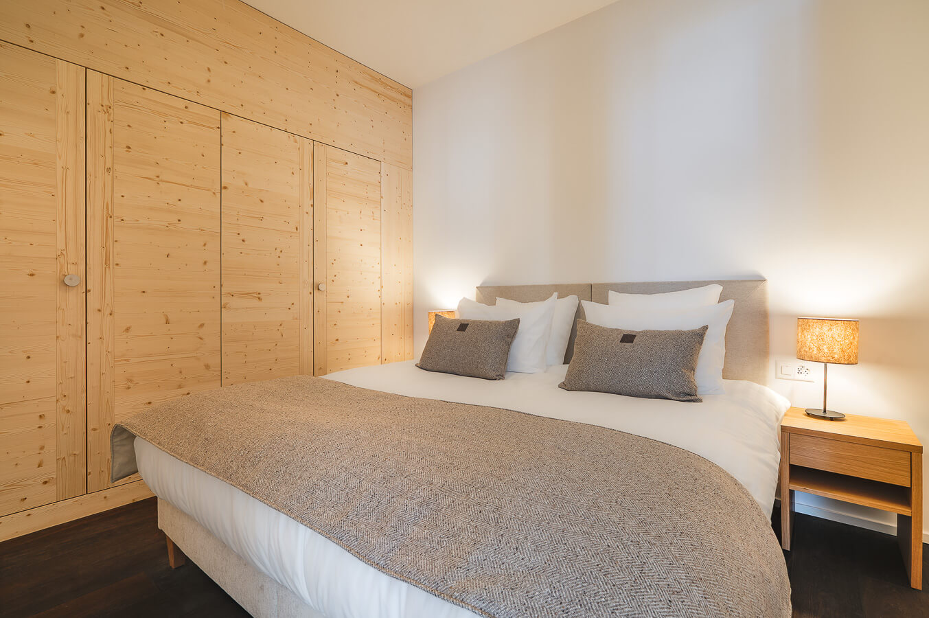 Diese Wohnung verfügt über ein Schlafzimmer mit Doppelbett (180 × 200 cm), ein fensterloses Schlafzimmer mit zwei Einzelbetten (90 × 200 cm), ein Kabinenschlafzimmer mit Etagenbett sowie über zwei Badezimmer. Der Wohnbereich bietet eine Sitzecke mit Fernseher und eine voll ausgestattete offene Küche. Möblierte Balkone ergänzen den Wohnraum. Zur Ausstattung der Wohnung gehören Haushaltsgeräte wie Waschmaschine, Geschirrspüler, Nespresso-Kaffeemaschine, notwendige Küchenutensilien usw.
