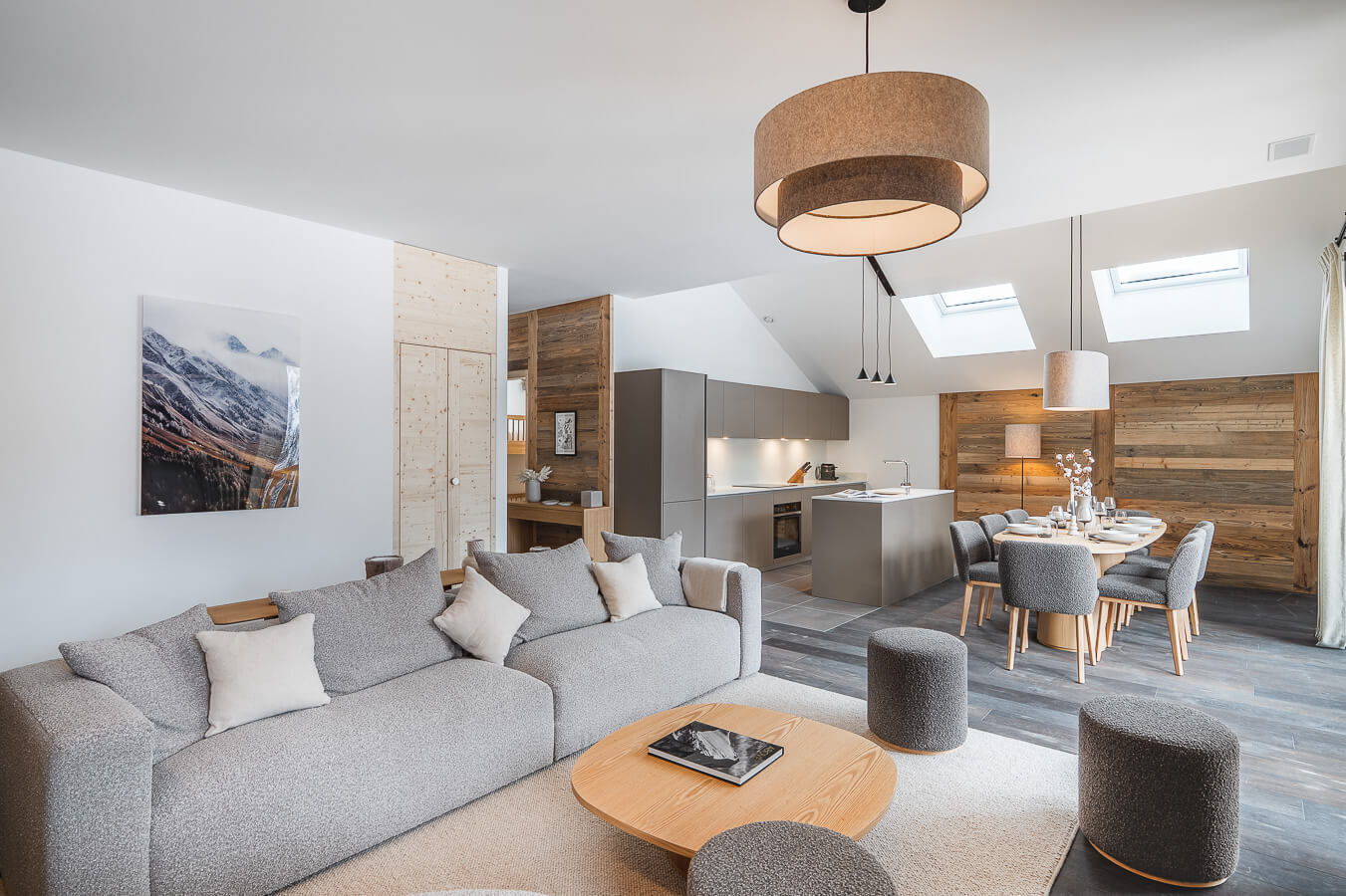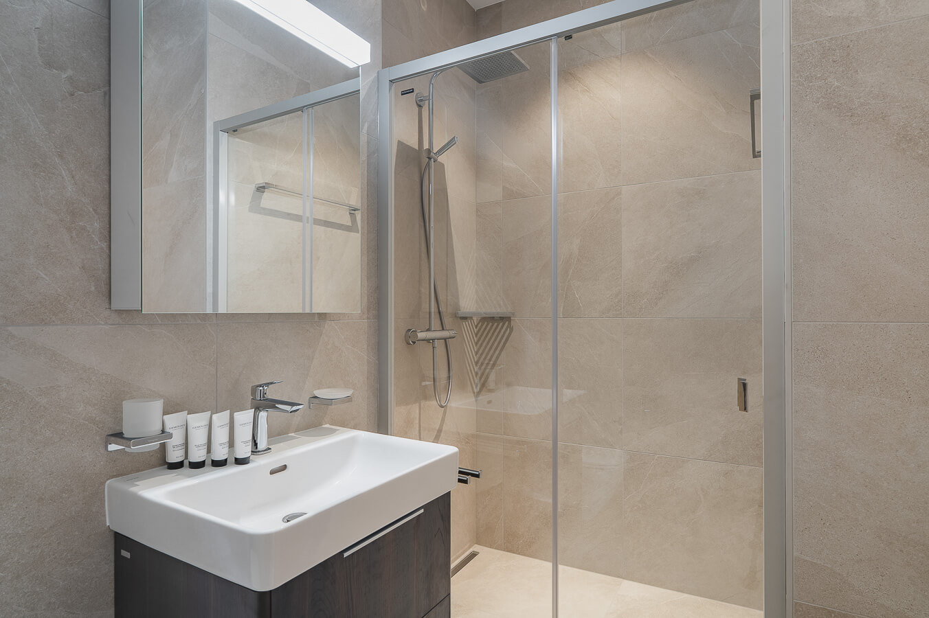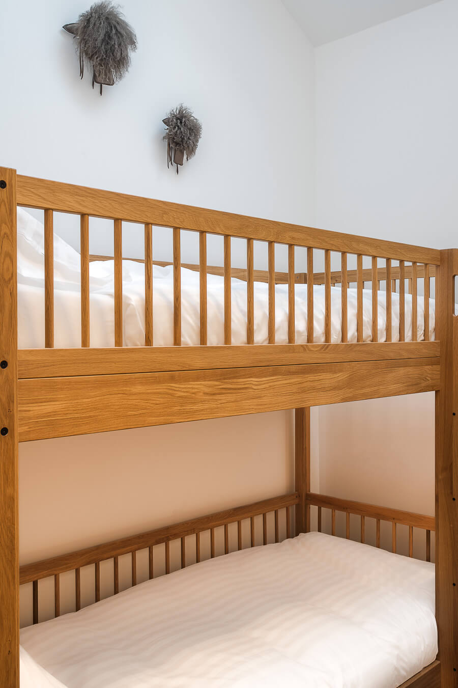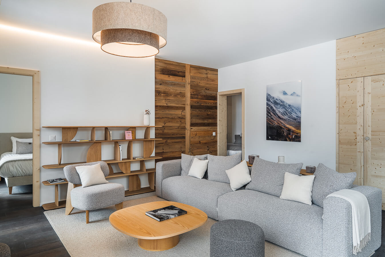 Diese Wohnung verfügt über ein Schlafzimmer mit Doppelbett (180 × 200 cm), ein fensterloses Schlafzimmer mit zwei Einzelbetten (90 × 200 cm), ein Kabinenschlafzimmer mit Etagenbett sowie über zwei Badezimmer. Der Wohnbereich bietet eine Sitzecke mit Fernseher und eine voll ausgestattete offene Küche. Möblierte Balkone ergänzen den Wohnraum. Zur Ausstattung der Wohnung gehören Haushaltsgeräte wie Waschmaschine, Geschirrspüler, Nespresso-Kaffeemaschine, notwendige Küchenutensilien usw.