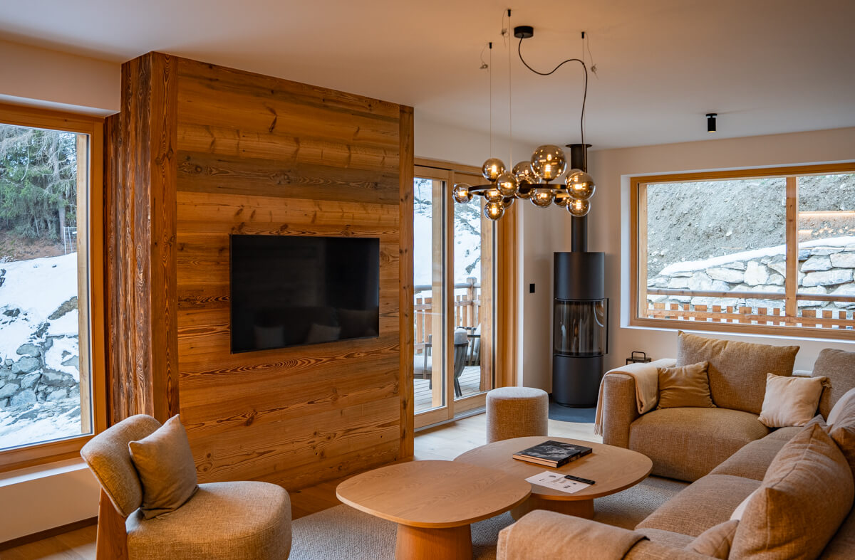 Dieses freistehende Chalet auf drei Ebenen verfügt über drei Schlafzimmer mit Doppelbett (180 × 200 cm), ein Zimmer mit zwei Etagenbetten sowie drei Badezimmer mit Dusche und Badewanne. Der Wohnbereich bietet eine Sitzecke mit Fernseher, eine voll ausgestattete Küche, einen Holzofen und Außenbereiche, darunter eine nach Süden ausgerichtete Terrasse mit freiem Blick auf Sorebois. Das Chalet ist rundum ausgerichtet, wodurch sich Licht und Aussicht im Tagesverlauf ständig verändern. Zur Ausstattung gehören Haushaltsgeräte wie Waschmaschine und Trockner, Geschirrspüler, Nespresso-Kaffeemaschine, notwendige Küchenutensilien usw.