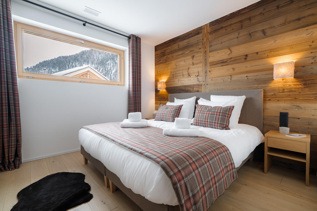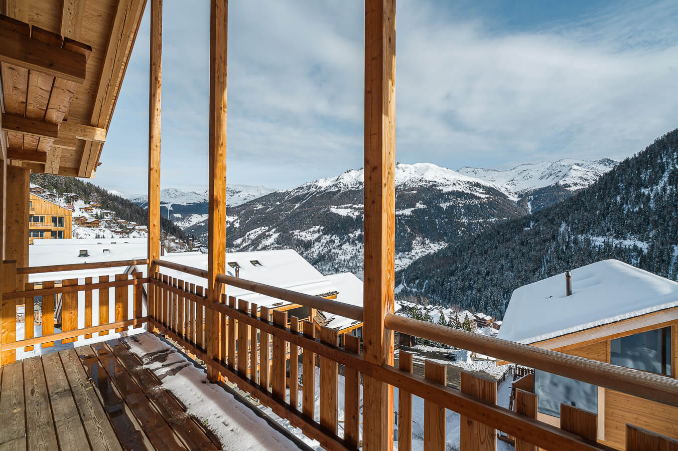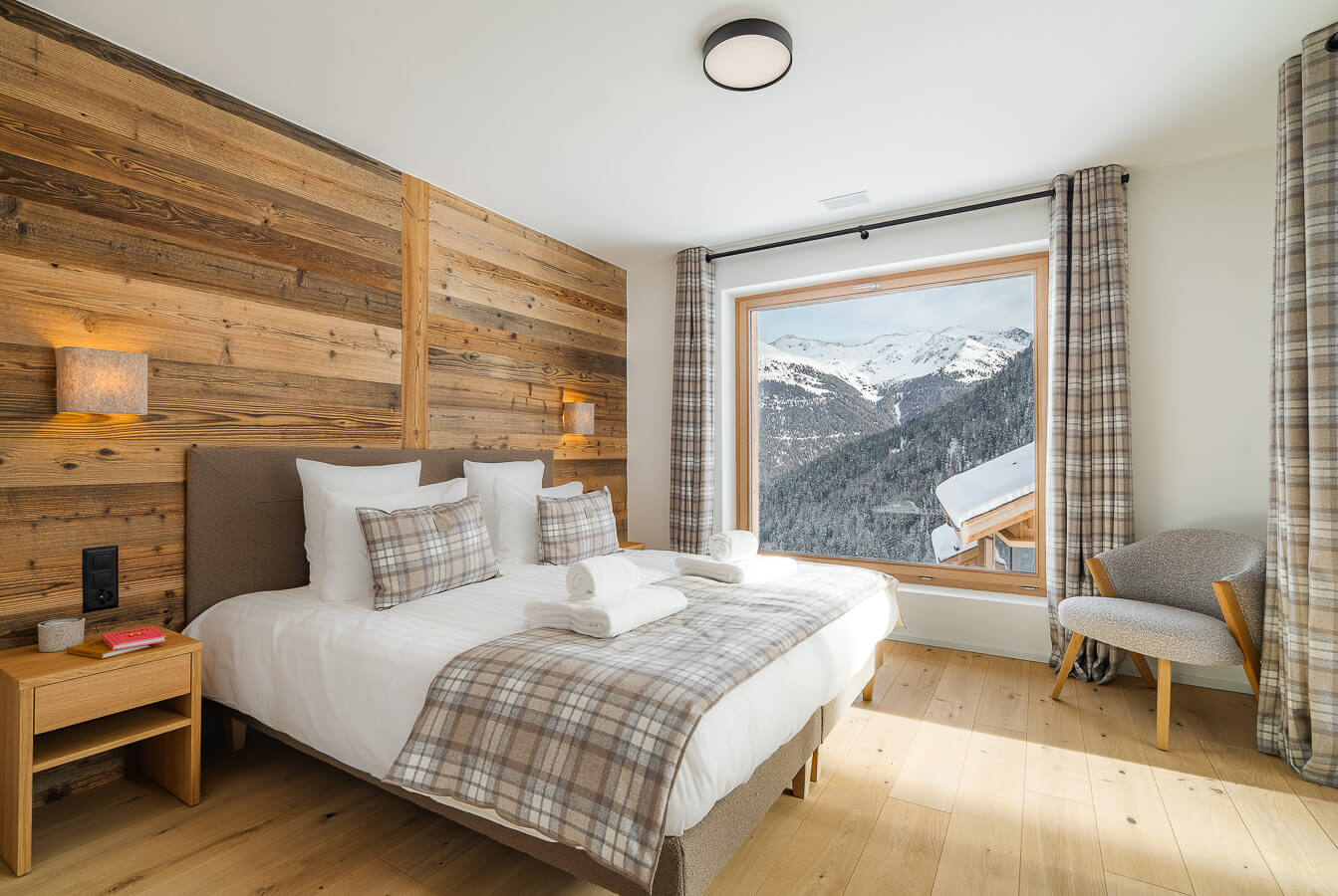 Dieses freistehende Chalet auf vier Ebenen verfügt über vier Schlafzimmer mit Doppelbett (180 × 200 cm), ein Zimmer mit zwei Etagenbetten (90 × 200 cm) sowie fünf ensuite Badezimmer mit Dusche. Der Wohnbereich bietet eine Sitzecke mit Fernseher, eine voll ausgestattete Küche, einen Holzofen und Außenbereiche mit freiem Blick auf die umliegenden Gipfel. Das Chalet ist rundum ausgerichtet, sodass sich Licht und Aussicht im Tagesverlauf ständig verändern. Zur Ausstattung gehören Haushaltsgeräte wie Waschmaschine und Trockner, Geschirrspüler, Nespresso-Kaffeemaschine, notwendige Küchenutensilien usw.