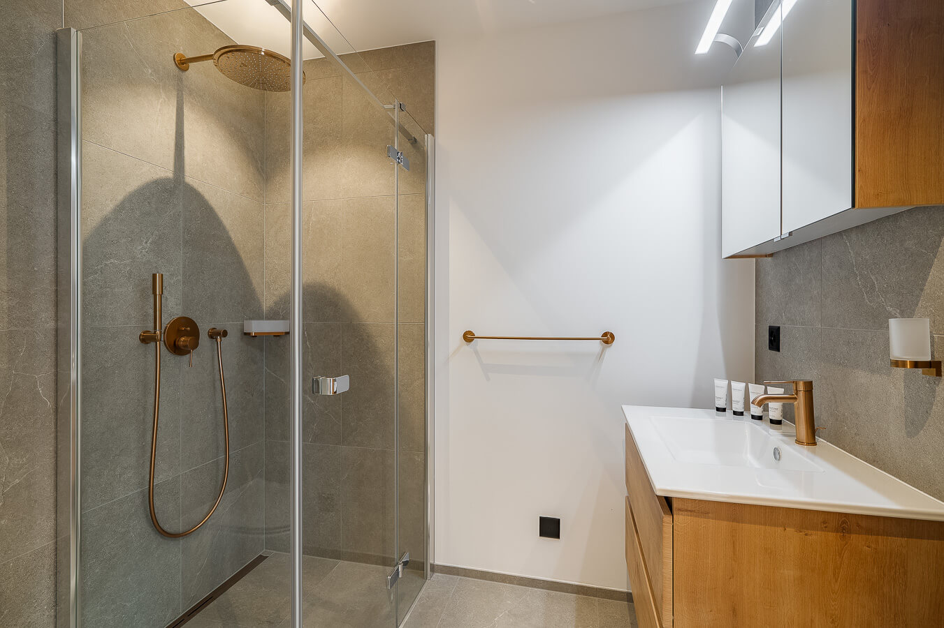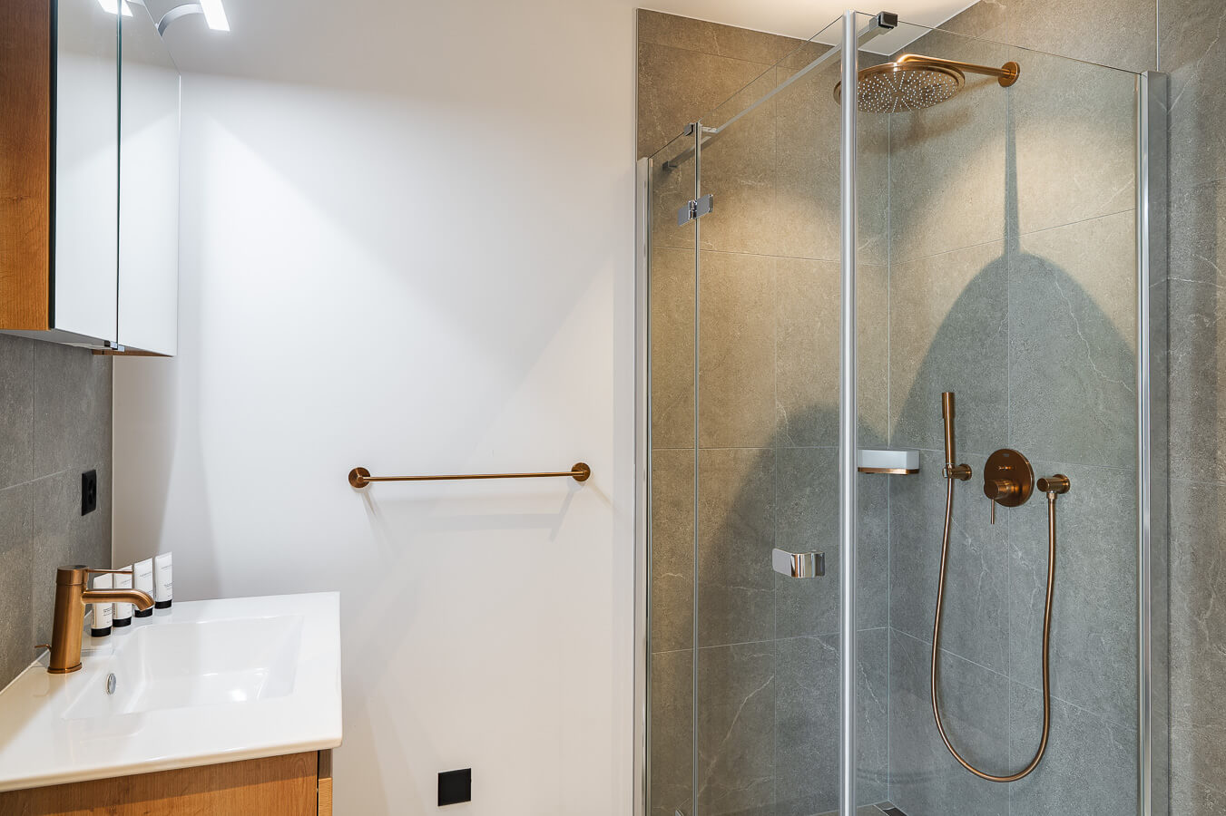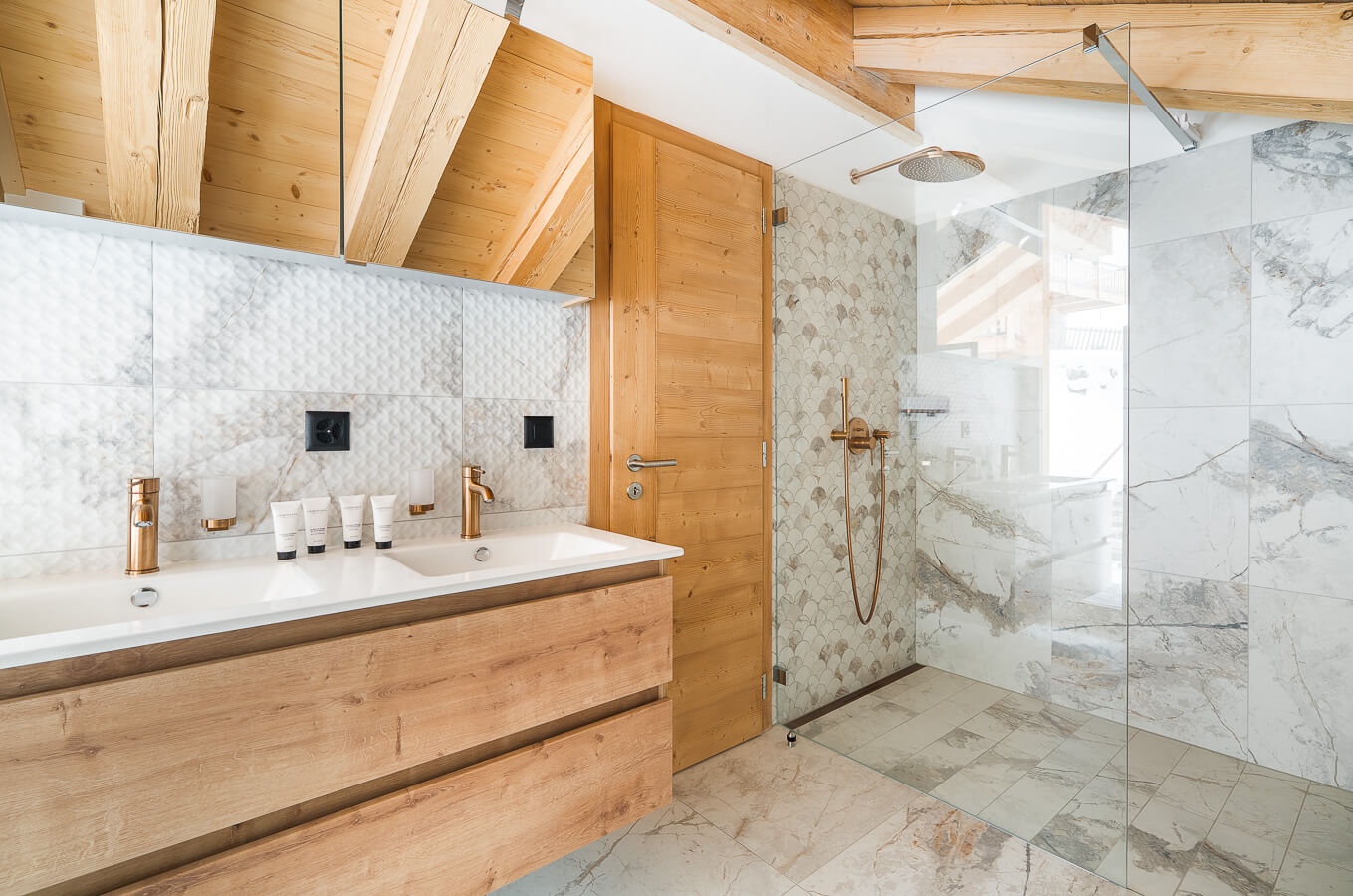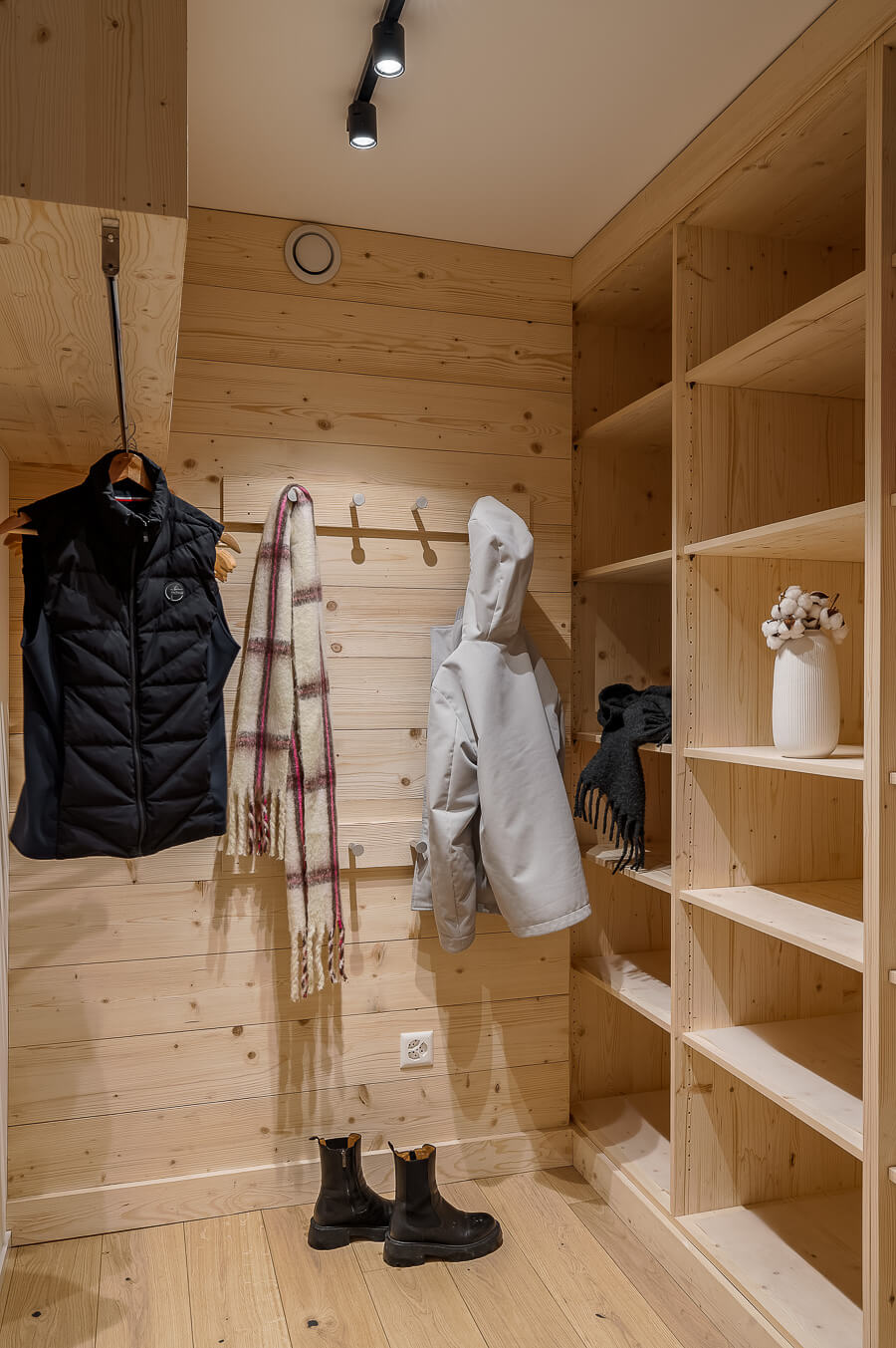 Dieses freistehende Chalet auf vier Ebenen verfügt über vier Schlafzimmer mit Doppelbett (180 × 200 cm), ein Zimmer mit zwei Etagenbetten (90 × 200 cm) sowie fünf ensuite Badezimmer mit Dusche. Der Wohnbereich bietet eine Sitzecke mit Fernseher, eine voll ausgestattete Küche, einen Holzofen und Außenbereiche mit freiem Blick auf die umliegenden Gipfel. Das Chalet ist rundum ausgerichtet, sodass sich Licht und Aussicht im Tagesverlauf ständig verändern. Zur Ausstattung gehören Haushaltsgeräte wie Waschmaschine und Trockner, Geschirrspüler, Nespresso-Kaffeemaschine, notwendige Küchenutensilien usw.