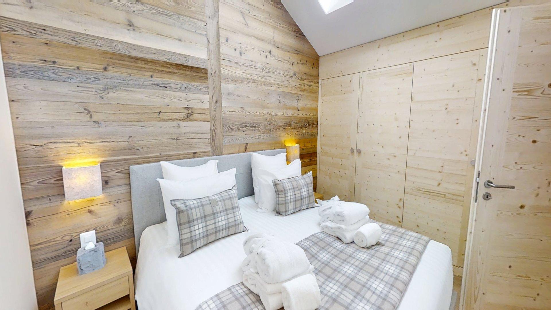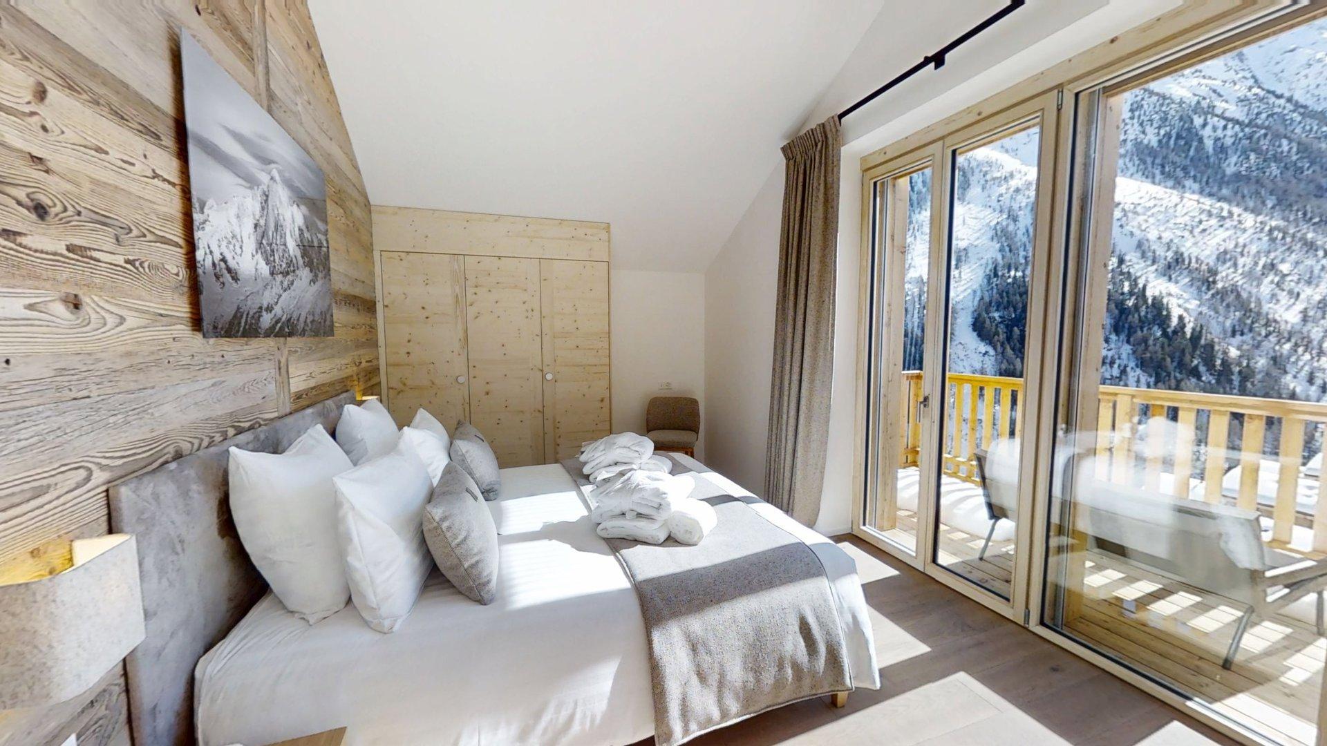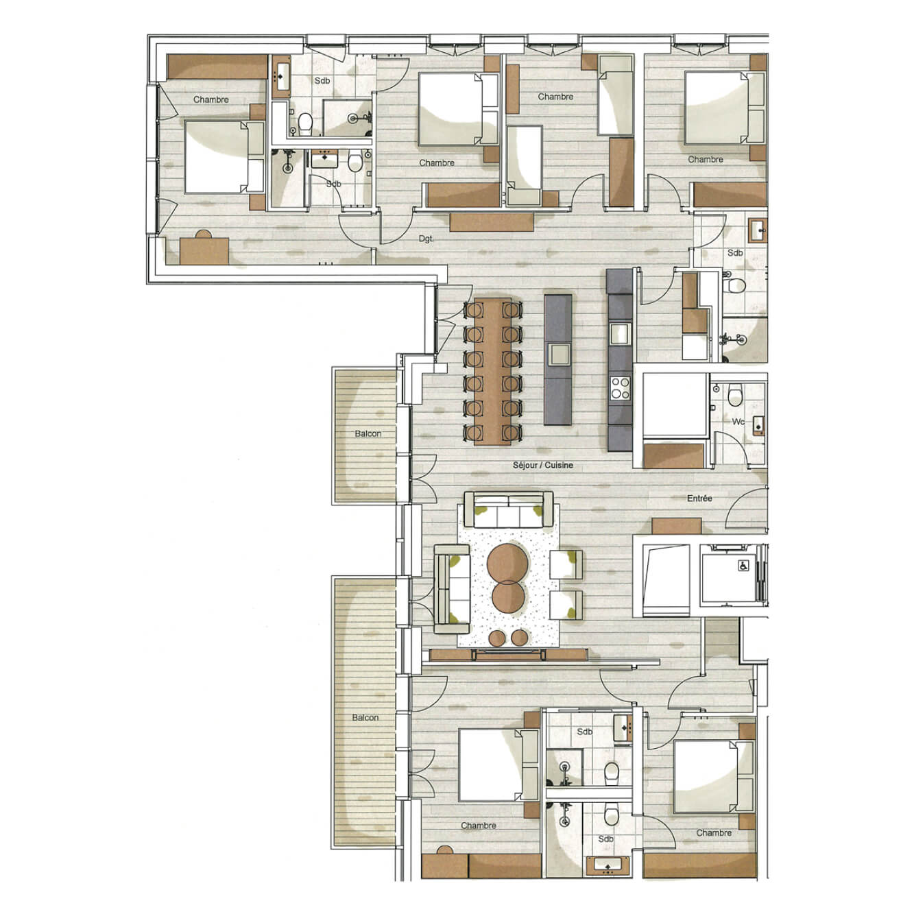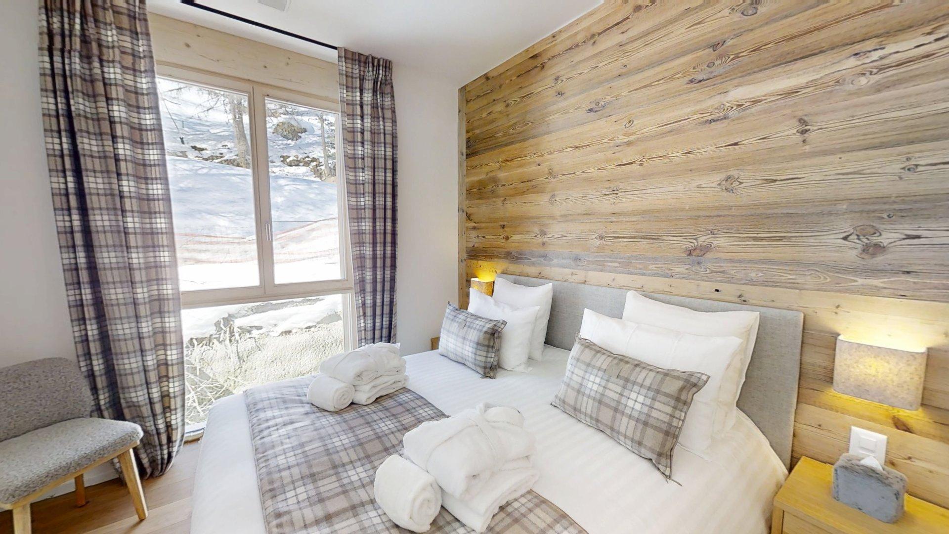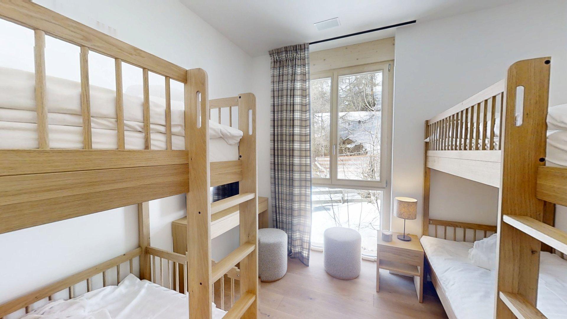This apartment includes four bedrooms with a double bed (180200), one bedroom with two bunkbeds, one windowless room with a double bed (180200), and five bathrooms. The living area features a lounge corner with a TV and a fully equipped open kitchen. Furnished balconies complete the space. This apartment is equipped with appliances such as a dishwasher, a Nespresso coffee machine, cooking essentials, etc.