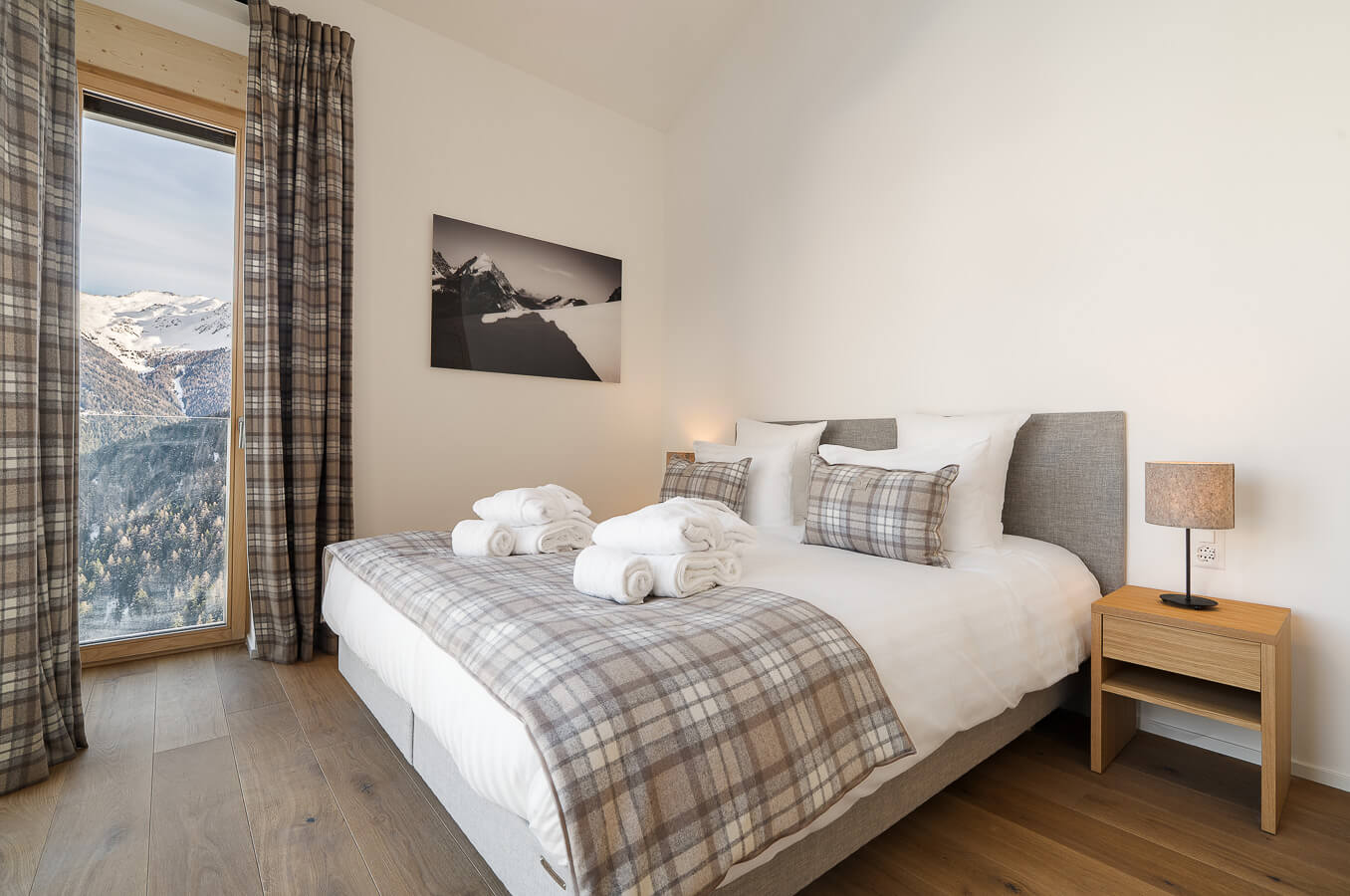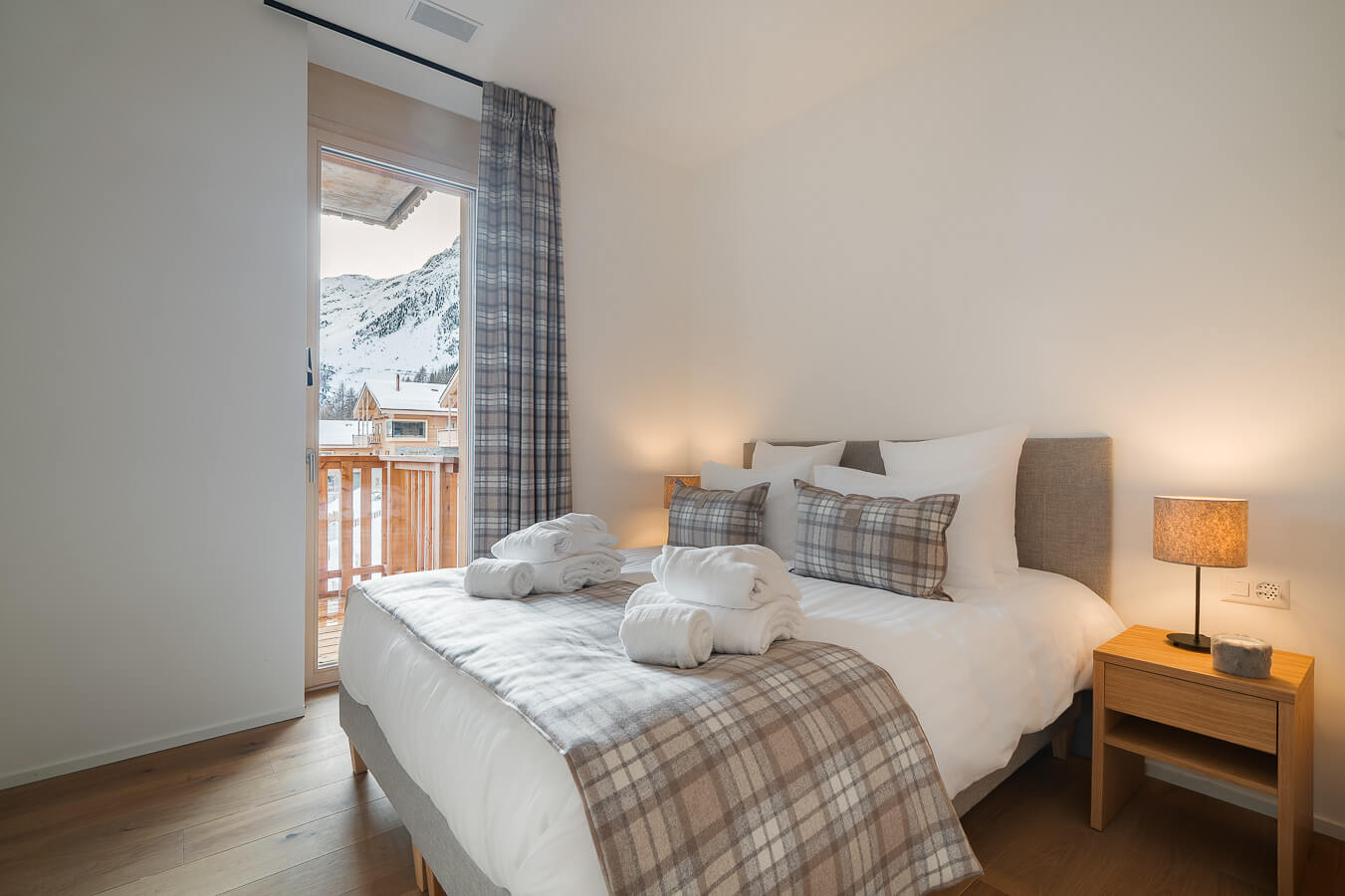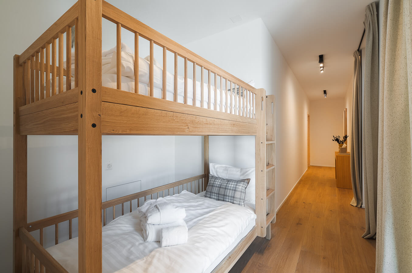 This apartment includes four bedrooms with a double bed (180*210, 160*200), a corridor converted into a cabin with a bunkbed, as well as three bathrooms. The living room features a lounge area with a TV, and a fully equipped open kitchen. Three balconies complete the space. This apartment also includes a collection of household appliances, such as a dishwasher, a Nespresso machine, cooking utensils, etc.
