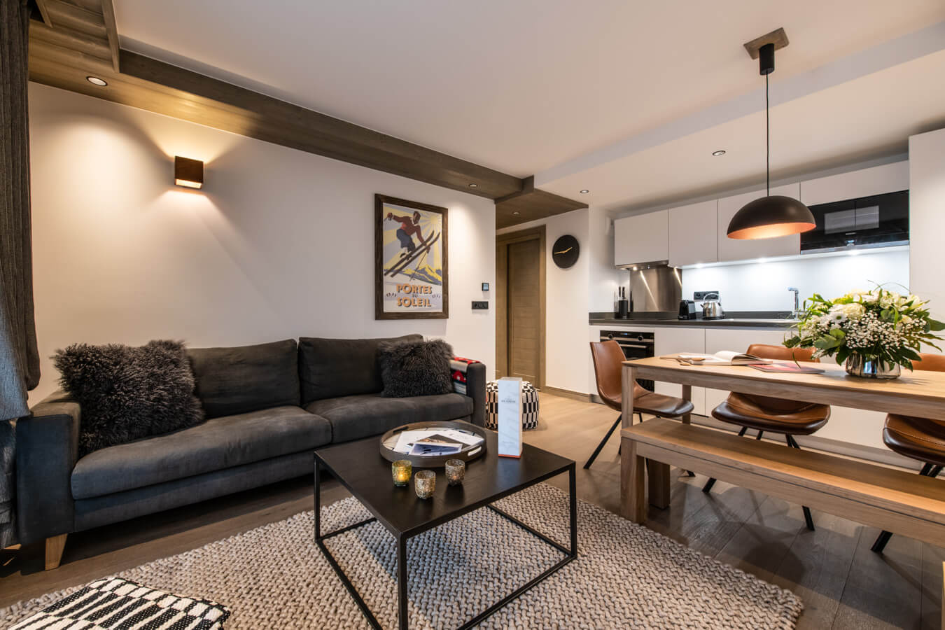 This apartment includes one bedroom with a double bed (180*200), one bedroom with two bunkbeds, as well as two en-suite bathrooms. The living area features a lounge corner with a TV and a fully equipped open kitchen. A furnished balcony completes the space. This apartment also includes household appliances such as a washing machine and dryer, a dishwasher, a Nespresso machine, cooking utensils, etc.