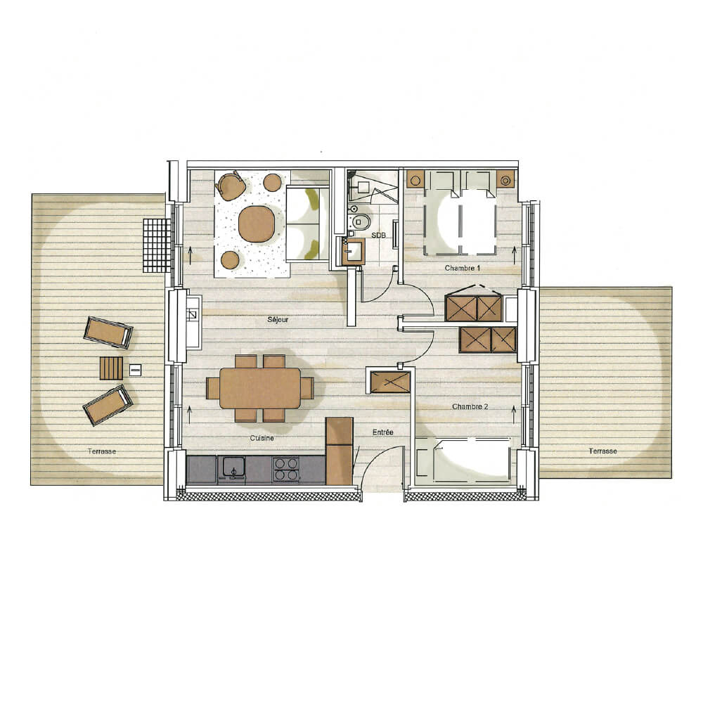 This chalet-apartment has one bedroom with a double bed (160x200), one bedroom with a single bed, as well as a bathroom with a shower. The living room includes a lounge area with a TV, a fully equipped kitchen, a wood stove, and two terraces, one of which offers full South exposure. This chalet boasts double exposure: South and North. It features a range of household equipment, including a dishwasher, a Nespresso coffee machine, cooking utensils, etc.