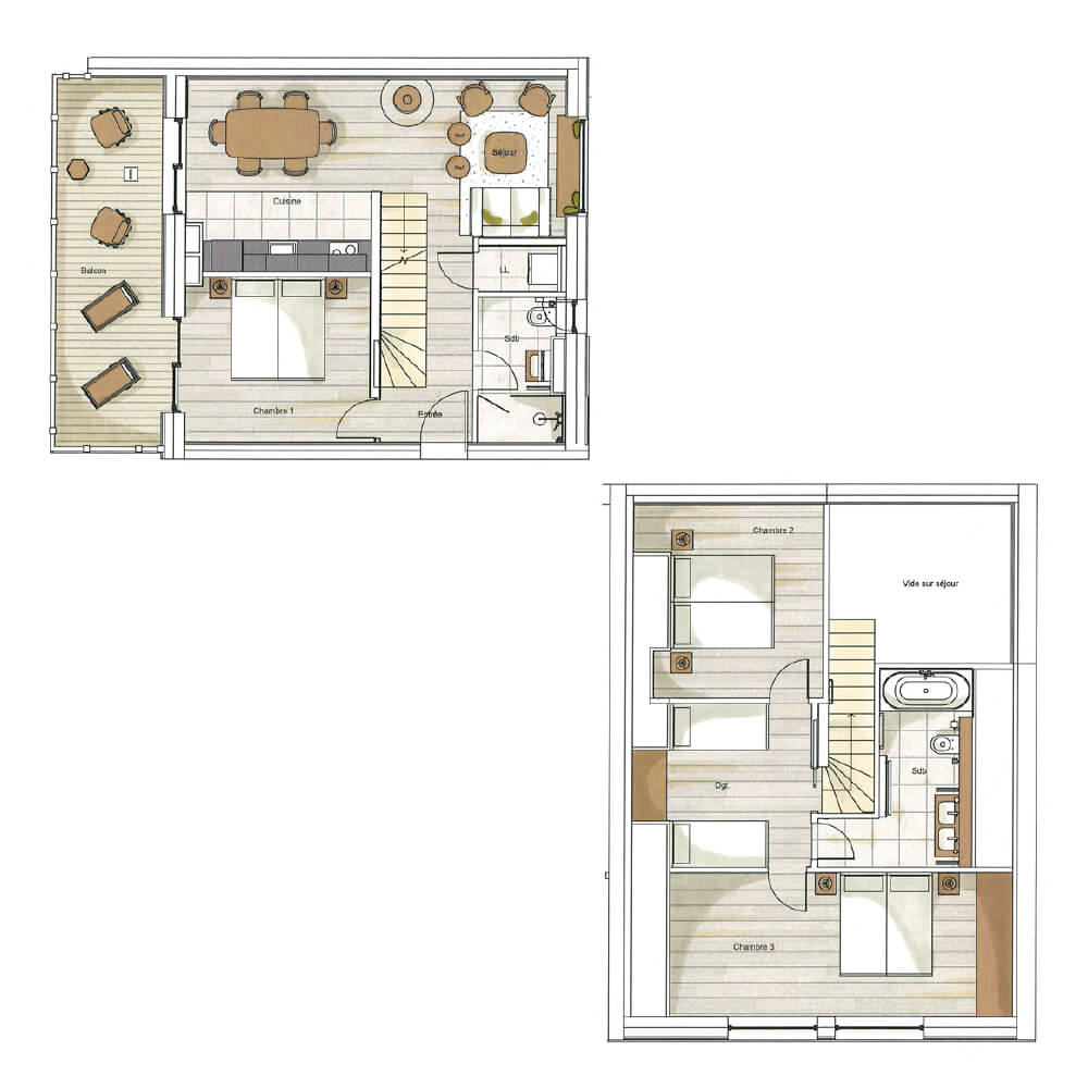 This duplex apartment features two delightful levels for a perfect stay in the mountains. Have a look at a plan of the apartment to understand how it is arranged and to see its sumptuous living quarters.