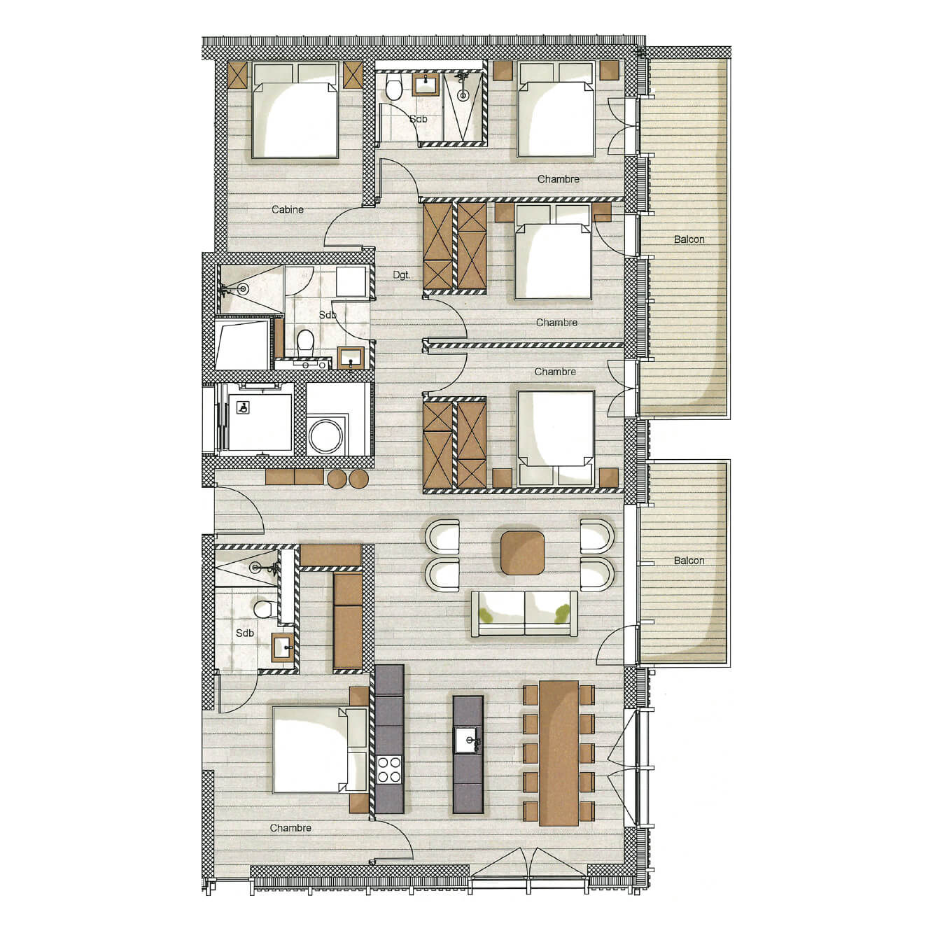 This apartment includes four bedrooms with a double bed (180*200, 160*200), a windowless room with a double bed (180*200), as well as three bathrooms. The living room features a lounge area with a TV, and a fully equipped open kitchen. Furnished balconies complete the space. This apartment also includes a collection of household appliances, such as a dishwasher, a Nespresso machine, cooking utensils, etc.