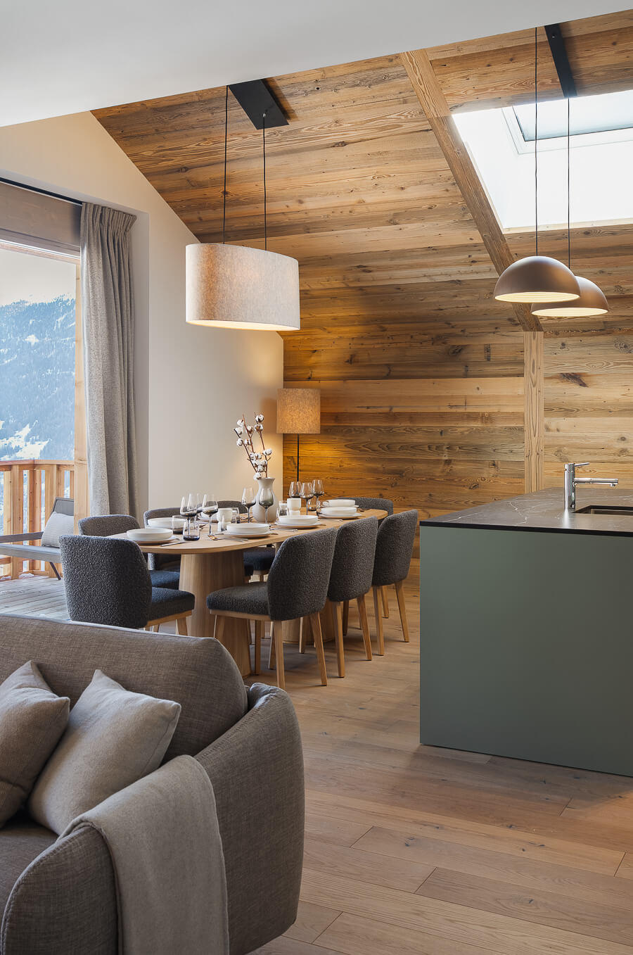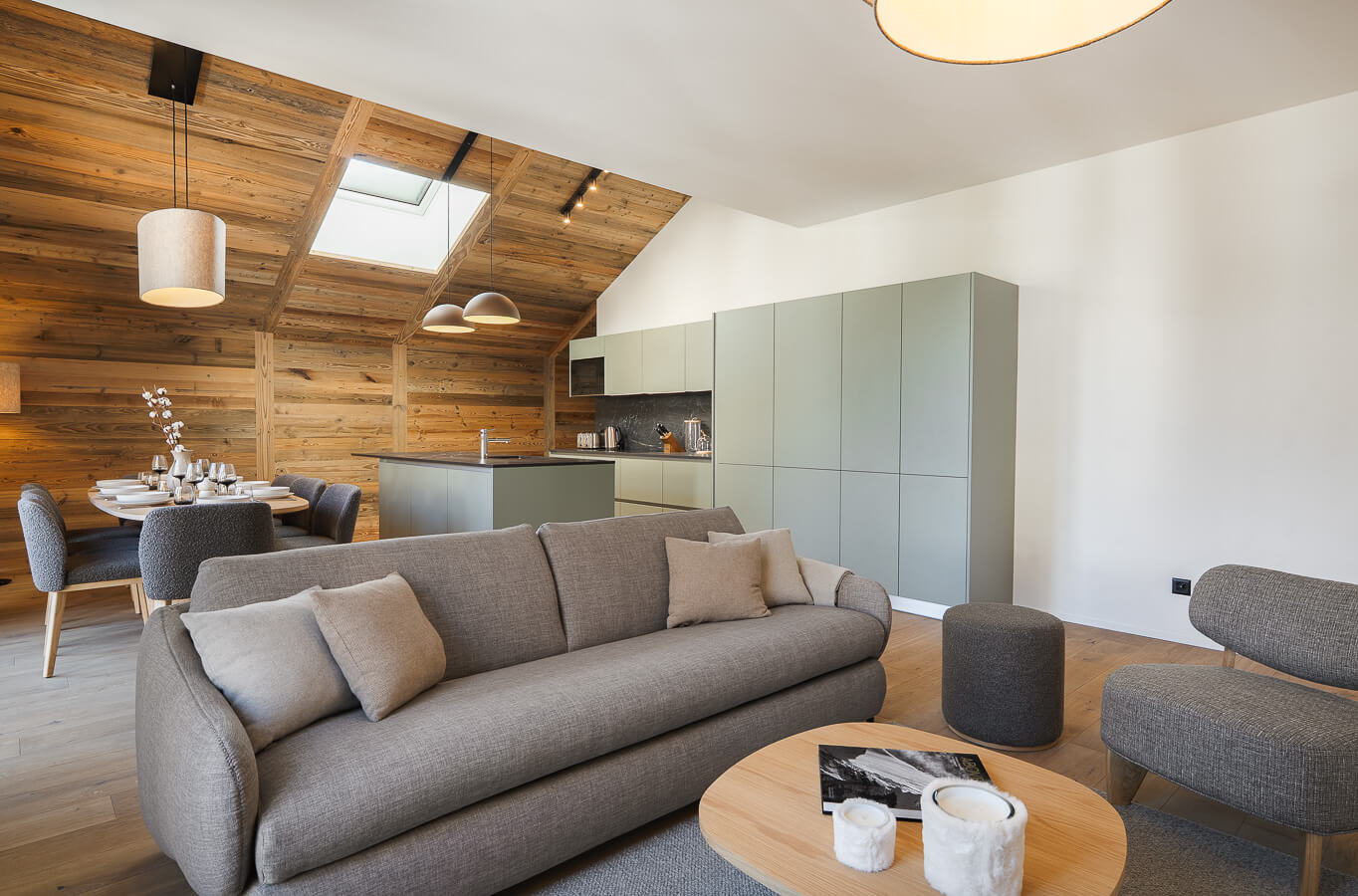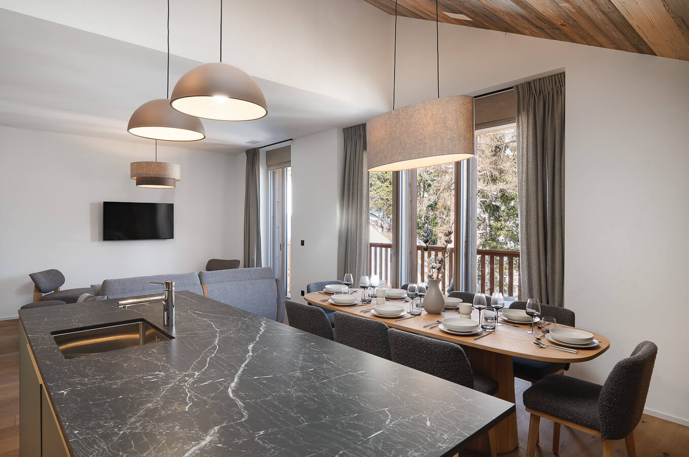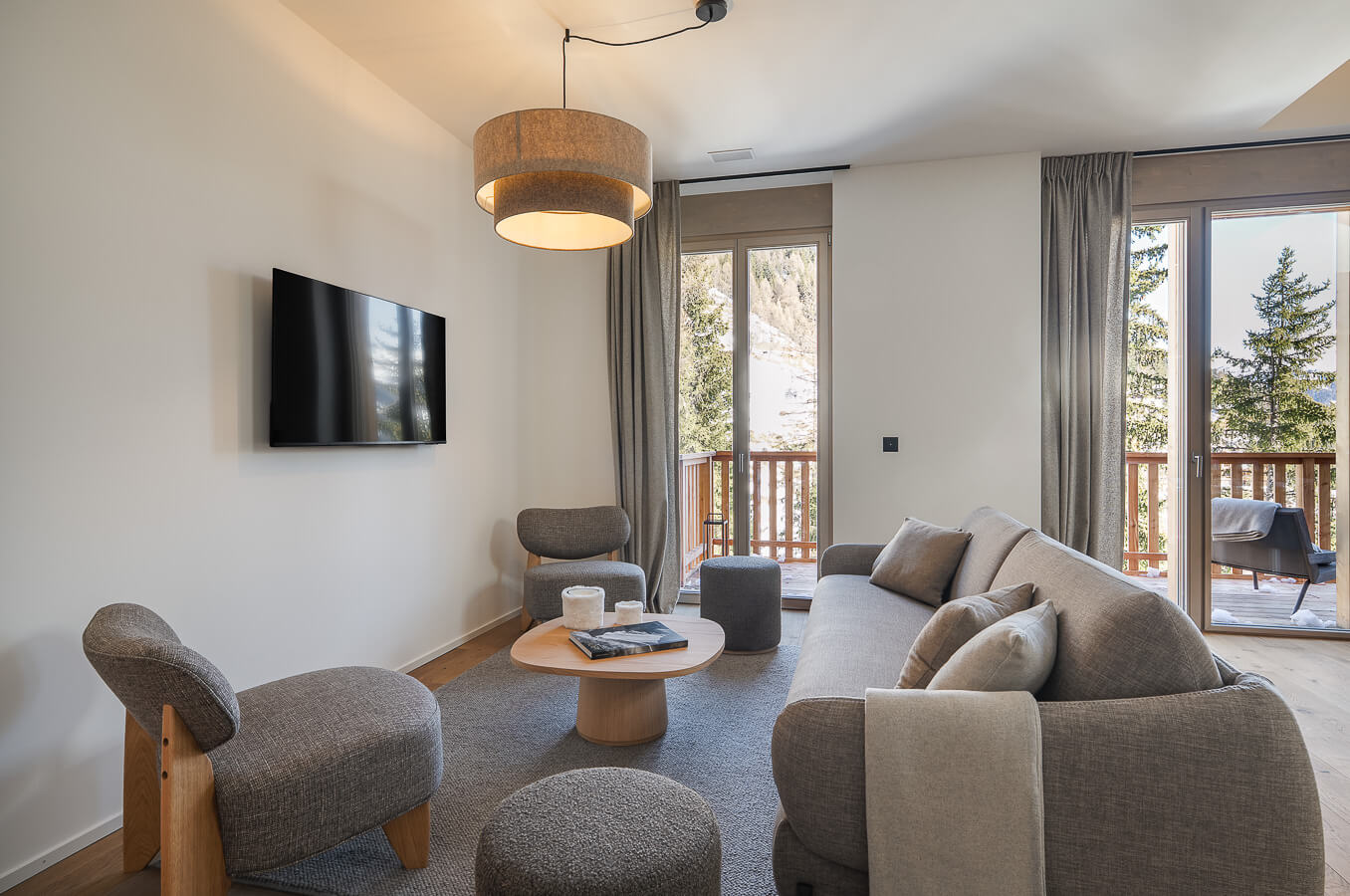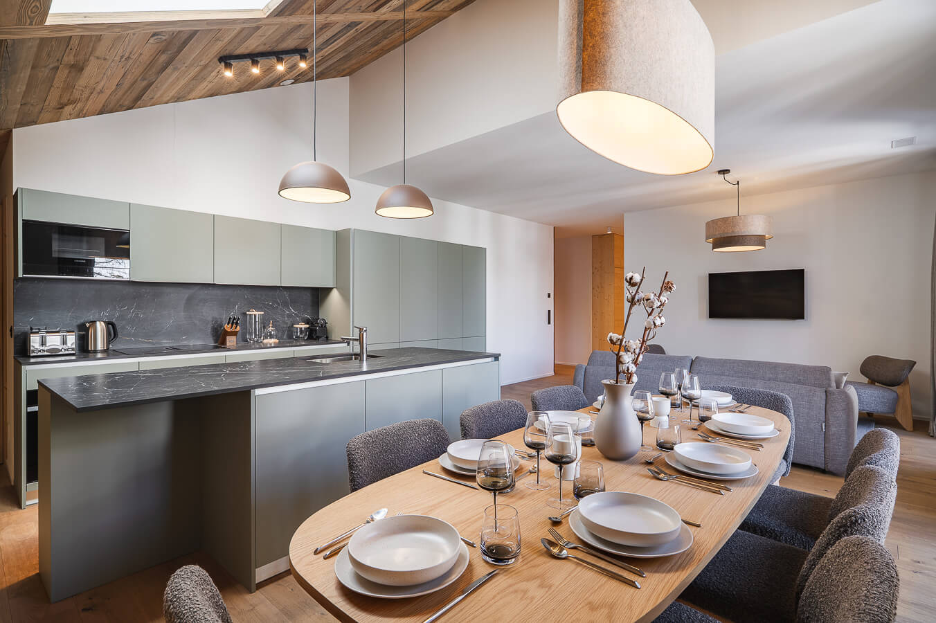 This apartment includes one bedroom with a double bed (180*200), a convertible sofa bed in the living room, and one bathroom. The living area features a lounge corner with a TV and a fully equipped open kitchen. A balcony completes the space. This apartment is equipped with appliances such as a dishwasher, a Nespresso coffee machine, cooking essentials, etc.