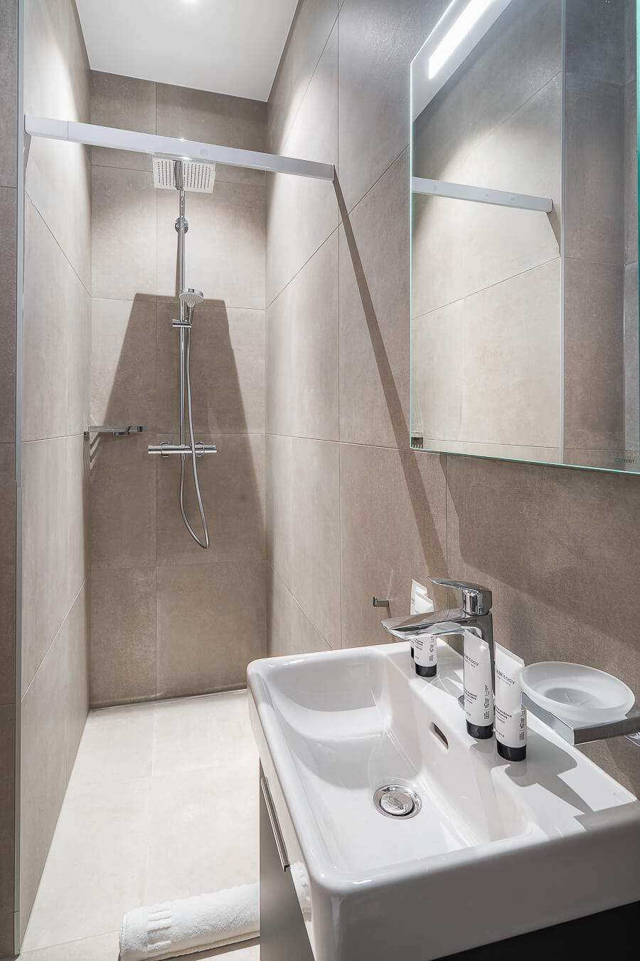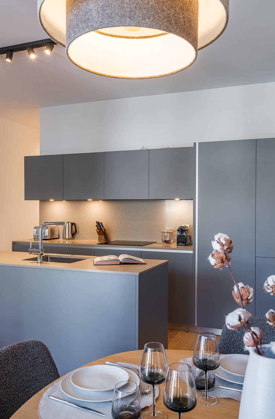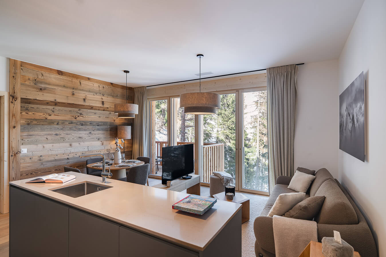 This apartment includes one bedroom with a double bed (160*200), a convertible sofa bed in the living room, and two bathrooms. The living area features a lounge corner with a TV and a fully equipped open kitchen. A balcony completes the space. This apartment is equipped with appliances such as a dishwasher, a Nespresso coffee machine, cooking essentials, etc.