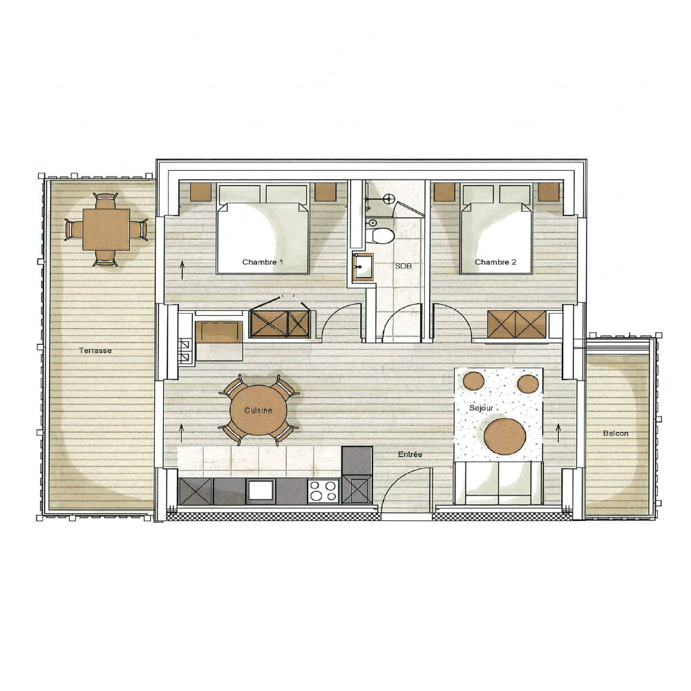 Ce chalet appartement dispose de deux chambres avec un lit double (180*200 & 140*200) ainsi que d’une salle de bain avec douche. La pièce de vie bénéficie d'un coin salon avec une télévision, d'une cuisine toute équipée, d’une cheminée à bois et de deux balcons dont un orienté plein sud avec la vue dégagée sur la montagne de Sorebois. Ce chalet bénéficie d'une double exposition : sud et nord. Il dispose d'appareils électroménagers tels qu'un lave-linge, un lave vaisselle, une machine à café Nespresso, le nécessaire de cuisine, etc.