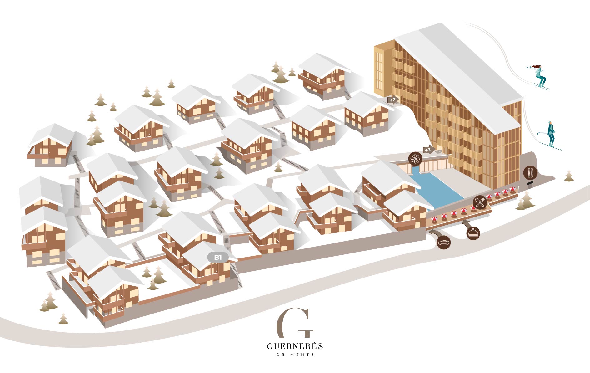 The private chalet B1, on the left southern part of the bottom row of chalets in the Guernerés resort, is built on three levels over a surface area of 179 m², and can sleep up to 8 guests, with a maximum of 6 adults.