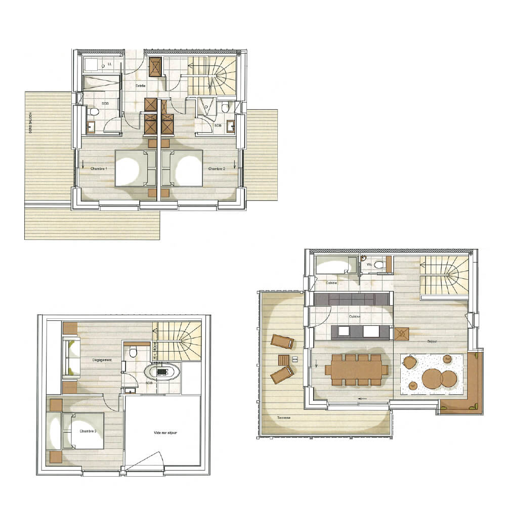 This triplex chalet offers three levels of happiness for your stay in the mountains. Discover the interior plan of this chalet to understand its layout and enjoy beautiful living spaces.