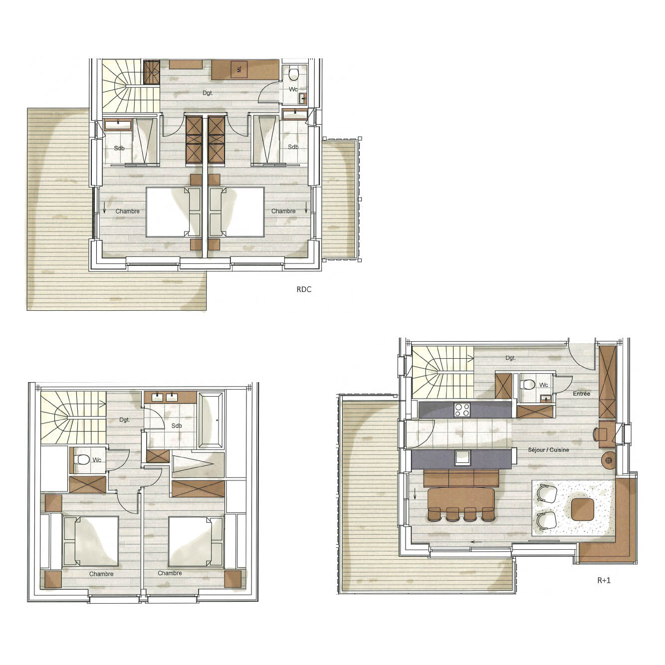 This triplex chalet offers three levels of happiness for your stay in the mountains. Discover the interior plan of this chalet to understand its layout and enjoy beautiful living spaces.