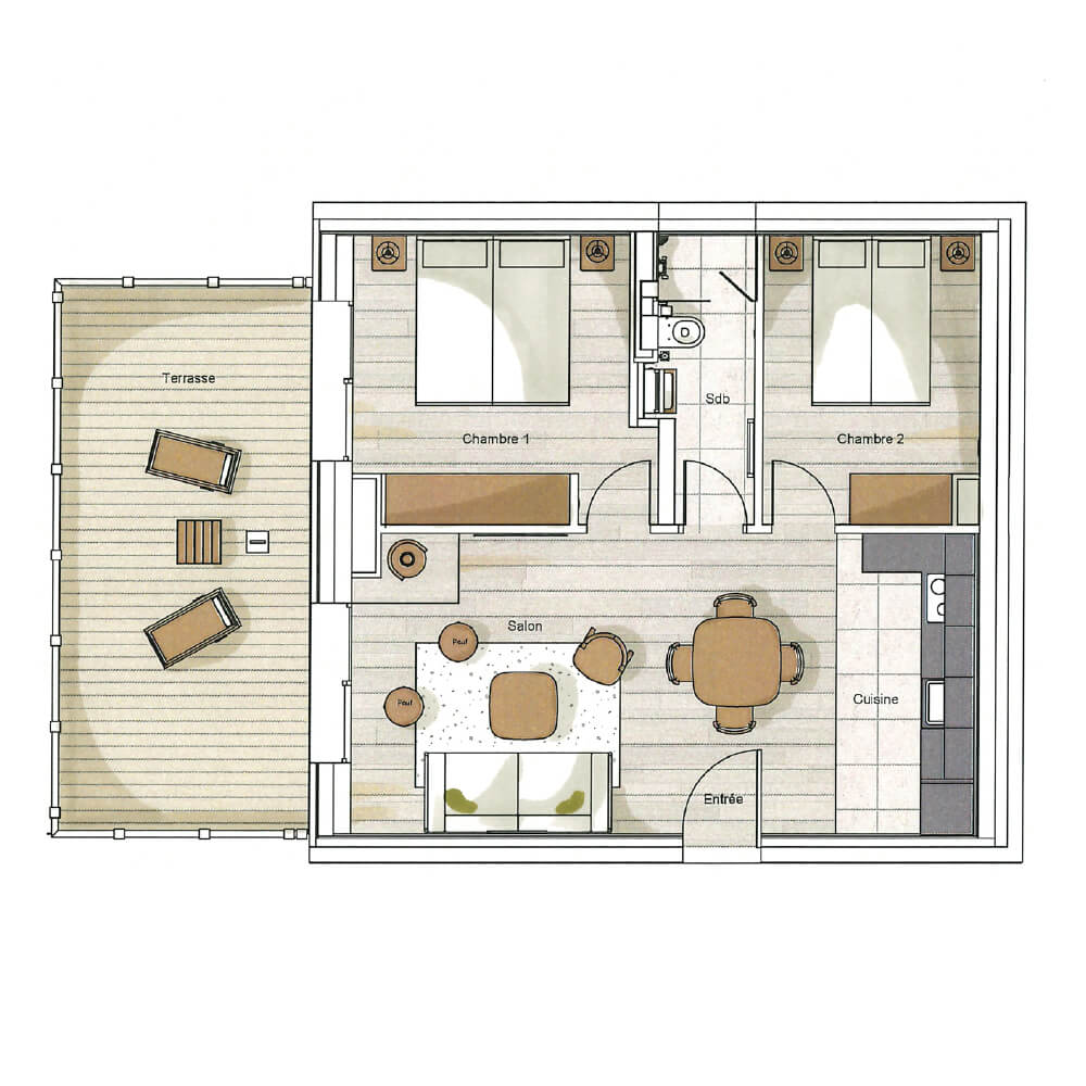Chalet-apartment E2, located on the ground floor of chalet E, on the far-right northern corner of the bottom row of chalets in the Guernerés resort, covers 69 m² and can sleep up to 4 guests.