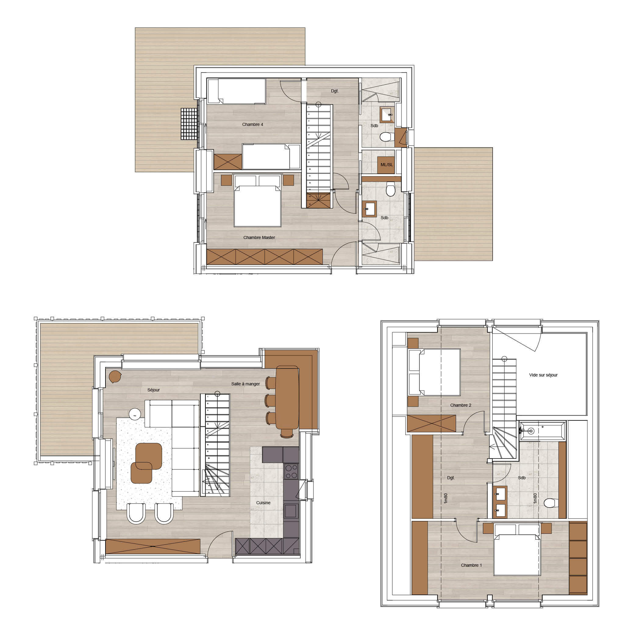 This triplex chalet offers three levels of happiness for your stay in the mountains. Discover the interior plan of this chalet to understand its layout and enjoy beautiful living spaces.