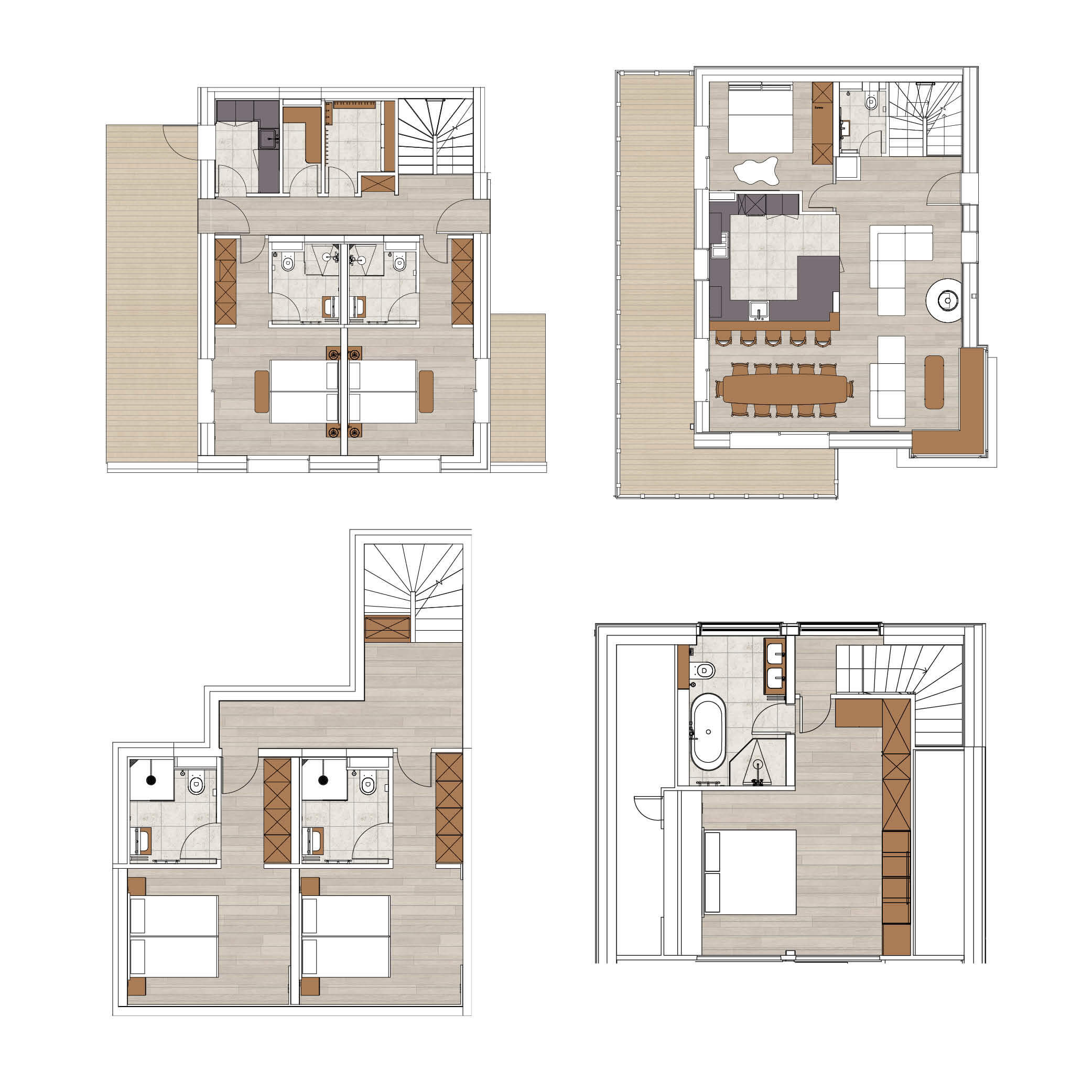 The private chalet P, on the far-right northern corner of the top row of chalets in the Guernerés resort, is built on four levels over a surface area of 254 m² and can sleep up to 10 guests.