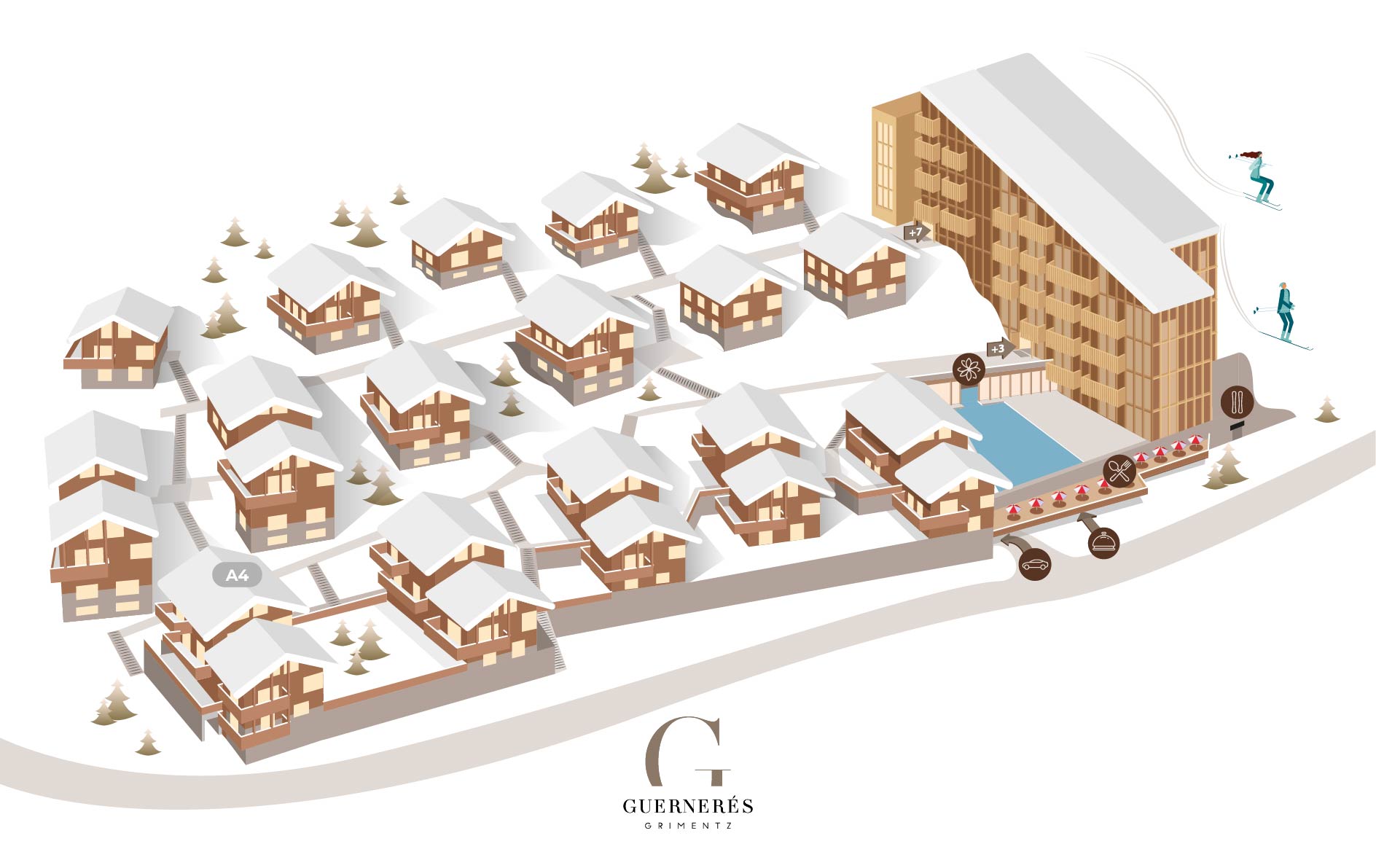 Le chalet appartement A4, en duplex situé aux deuxième et dernier niveaux du chalet A, à l’extrémité gauche côté sud en ligne inférieure de la partie Chalets du resort Guernerés, offre une superficie de 100 m², pouvant accueillir jusqu'à 6 personnes.
