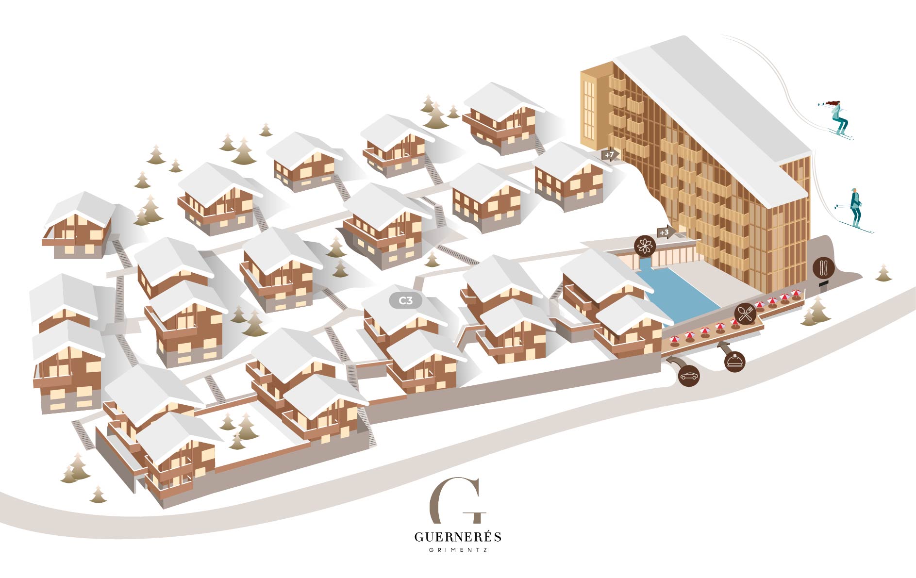 Le chalet appartement C3, en duplex situé aux premier et dernier niveaux du chalet C, au milieu en ligne inférieure de la partie Chalets du resort Guernerés, offre une superficie de 100 m², pouvant accueillir jusqu'à 6 personnes.